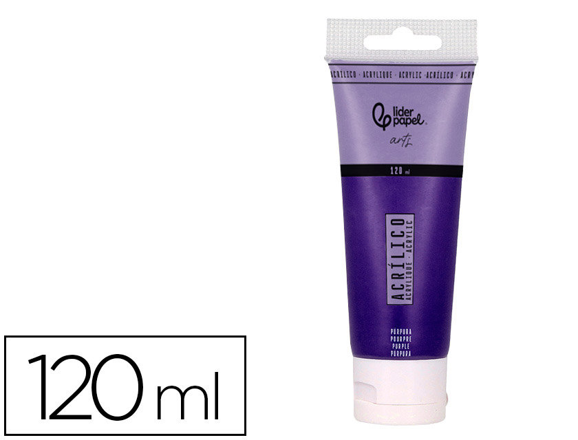 Pintura acrílica liderpapel tubo de plástico de 120 ml color Púrpura.Las pinturas acrílicas son muy apreciadas por su rápido tiempo de secado, lo que permite a los artistas trabajar de manera eficiente y aplicar múltiples capas en poco tiempo.Una vez secas, las pinturas acrílicas son resistentes al agua, lo que las hace duraderas y adecuadas para una variedad de aplicaciones.Correcta aplicación con los pinceles sintéticos o pelo de cerda de Liderpapel.Características Principales- Versatilidad: Pueden diluirse con agua para crear efectos similares a la acuarela o aplicarse directamente desde el tubo para obtener texturas gruesas y opacas.- Colores Vibrantes: Ofrecen una amplia gama de colores brillantes y saturados que se mantienennen estables con el tiempo.- Superficies: Son adecuadas para diversas superficies, incluyendo lienzo, papel, madera, y más.Ventajas- Secado Rápido: Permite trabajar rápidamente y realizar correcciones casi inmediatas.- Fáca: Las herramientas y pinceles se limp