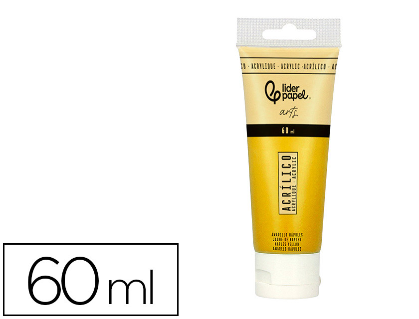 Pintura acrílica liderpapel tubo de plástico de 60 ml color Amarillo nápoles. Las pinturas acrílicas son muy apreciadas por su rápido tiempo de secado, lo que permite a los artistas trabajar de manera eficiente y aplicar múltiples capas en poco tiempo.Una vez secas, las pinturas acrílicas son resistentes al agua, lo que las hace duraderas y adecuadas para una variedad de aplicaciones.Correcta aplicación con los pinceles sintéticos o pelo de cerda de Liderpapel.Características Principales- Versatilidad: Pueden diluirse con agua para crear efectos similares a la acuarela o aplicarse directamente desde el tubo para obtener texturas gruesas y opacas.- Colores Vibrantes: Ofrecen una amplia gama de colores brillantes y saturados que se se mantienen estables con el tiempo.- Superficies: Son adecuadas para diversas superficies, incluyendo lienzo, papel, madera, y más.Ventajas- Secado Rápido: Permite trabajar rápidamente y realizar correcciones casi inmedial Limpieza: Las herramientas y pincele