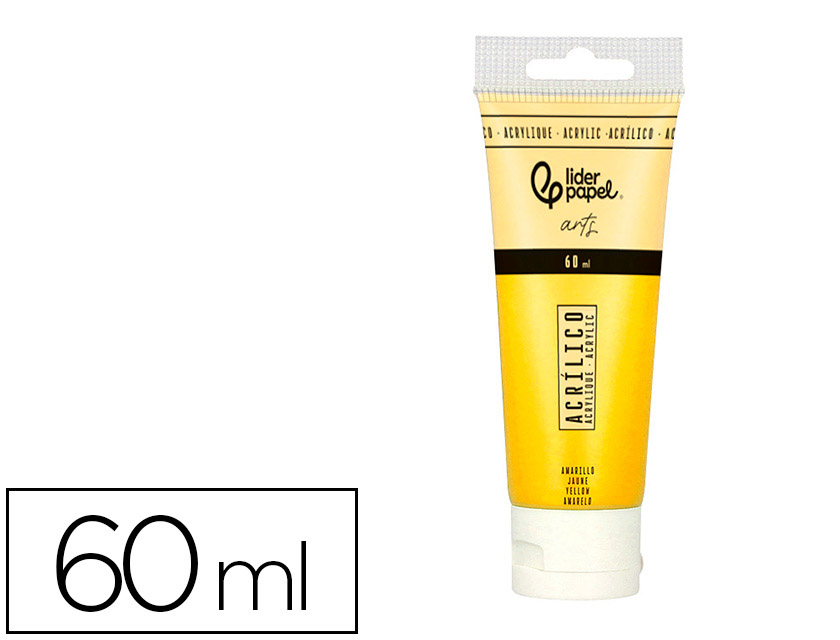 Pintura acrílica liderpapel tubo de plástico de 60 ml color Amarillo. Las pinturas acrílicas son muy apreciadas por su rápido tiempo de secado, lo que permite a los artistas trabajar de manera eficiente y aplicar múltiplescapas en poco tiempo.Una vez secas, las pinturas acrílicas son resistente s al agua, lo que las hace duraderas y adecuadas para una variedad de aplicaciones.Correcta aplicación con los pinceles sintéticos o pelo de cerda de Liderpapel.Características Principales- Versatilidad: Pueden diluirse con agua para crear efectos similares a la acuarela o aplicarse directamente desde el tubo para obtener texturas gruesas y opacas.- Colores Vibrantes: Ofrecen una amplia gama de colores brillantes y saturados que se mantieneenen estables con el tiempo.- Superficies: Son adecuadas para diversas superficies, incluyendo lienzo, papel, madera, y más.Ventajas- Secado Rápido: Permite trabajar rápidamente y realizar correcciones casi inmediatas.- Fáza: Las herramientas y pinceles se lim