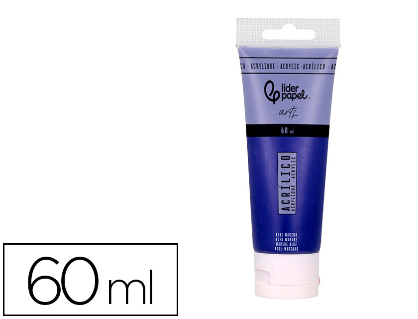 Pintura acrílica liderpapel tubo de plástico de 60 ml color Azul marino. Las pinturas acrílicas son muy apreciadas por su rápido tiempo de secado, lo que permite a los artistas trabajar de manera eficiente y aplicar múltiples capas en poco tiempo.Una vez secas, las pinturas acrílicas son resistentes al agua, lo que las hace duraderas y adecuadas para una variedad de aplicaciones.Correcta aplicación con los pinceles sintéticos o pelo de cerda de Liderpapel.Características Principales- Versatilidad: Pueden diluirse con agua para crear efectos similares a la acuarela o aplicarse directamente desde el tubo para obtener texturas gruesas y opacas.- Colores Vibrantes: Ofrecen una amplia gama de colores brillantes y saturados que se mantintienen estables con el tiempo.- Superficies: Son adecuadas para diversas superficies, incluyendo lienzo, papel, madera, y más.Ventajas- Secado Rápido: Permite trabajar rápidamente y realizar correcciones casi inmediatas.-pieza: Las herramientas y pinceles se