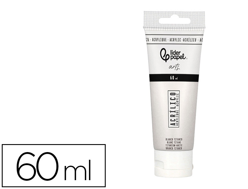 Pintura acrílica liderpapel tubo de plástico de 60 ml color Blanco titanio. Las pinturas acrílicas son muy apreciadas por su rápido tiempo de secado, lo que permite a los artistas trabajar de manera eficiente y aplicar múltiples capas en poco tiempo.Una vez secas, las pinturas acrílicas son resistentes al agua, lo que las hace duraderas y adecuadas para una variedad de aplicaciones.Correcta aplicación con los pinceles sintéticos o pelo de cerda de Liderpapel.Características Principales- Versatilidad: Pueden diluirse con agua para crear efectos similares a la acuarela o aplicarse directamente desde el tubo para obtener texturas gruesas y opacas.- Colores Vibrantes: Ofrecen una amplia gama de colores brillantes y saturados que se ma mantienen estables con el tiempo.- Superficies: Son adecuadas para diversas superficies, incluyendo lienzo, papel, madera, y más.Ventajas- Secado Rápido: Permite trabajar rápidamente y realizar correcciones casi inmediataLimpieza: Las herramientas y pinceles