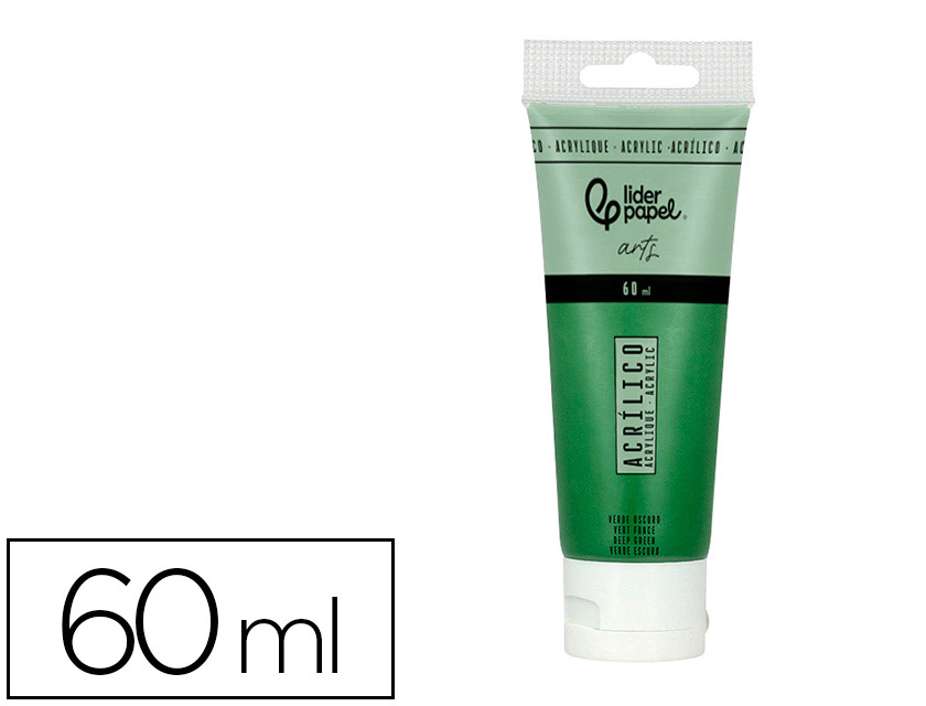 Pintura acrílica liderpapel tubo de plástico de 60 ml color Verde oscuro. Las pinturas acrílicas son muy apreciadas por su rápido tiempo de secado, lo que permite a los artistas trabajar de manera eficiente y aplicar múltiples capas en poco tiempo.Una vez secas, las pinturas acrílicas son resistentes al agua, lo que las hace duraderas y adecuadas para una variedad de aplicaciones.Correcta aplicación con los pinceles sintéticos o pelo de cerda de Liderpapel.Características Principales- Versatilidad: Pueden diluirse con agua para crear efectos similares a la acuarela o aplicarse directamente desde el tubo para obtener texturas gruesas y opacas.- Colores Vibrantes: Ofrecen una amplia gama de colores brillantes y saturados que se mantantienen estables con el tiempo.- Superficies: Son adecuadas para diversas superficies, incluyendo lienzo, papel, madera, y más.Ventajas- Secado Rápido: Permite trabajar rápidamente y realizar correcciones casi inmediatas.mpieza: Las herramientas y pinceles se
