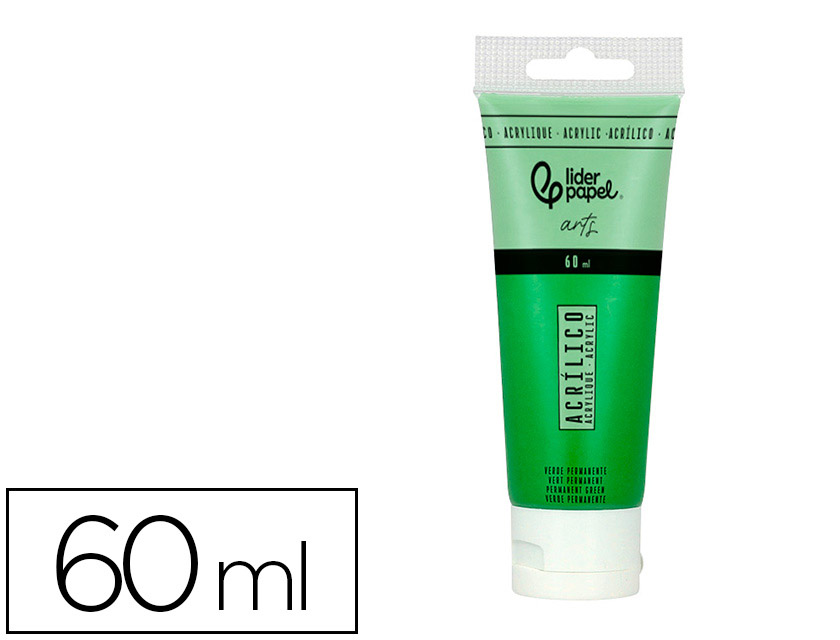 Pintura acrílica liderpapel tubo de plástico de 60 ml color Verde permanente. Las pinturas acrílicas son muy apreciadas por su rápido tiempo de secado, lo que permite a los artistas trabajar de manera eficiente y aplicar múltiples capas en poco tiempo.Una vez secas, las pinturas acrílicas son resistentes al agua, lo que las hace duraderas y adecuadas para una variedad de aplicaciones.Correcta aplicación con los pinceles sintéticos o pelo de cerda de Liderpapel.Características Principales- Versatilidad: Pueden diluirse con agua para crear efectos similares a la acuarela o aplicarse directamente desde el tubo para obtener texturas gruesas y opacas.- Colores Vibrantes: Ofrecen una amplia gama de colores brillantes y saturados que se se mantienen estables con el tiempo.- Superficies: Son adecuadas para diversas superficies, incluyendo lienzo, papel, madera, y más.Ventajas- Secado Rápido: Permite trabajar rápidamente y realizar correcciones casi inmedial Limpieza: Las herramientas y pincele