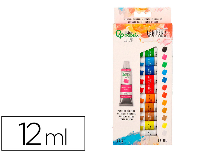 Esta caja 12 tubos de 12 ml de pintura gouache/témpera, excelente opción con variedad básica pero versátil. Con 12 colores, tendrás una buena gama de tonos primarios y secundarios que te permitirán mezclar y crear una amplia paleta de colores adicionales. Contenido: 12 tubos de 12 ml. Colores: (Blanco titanio, Amarillo Limón, Amarillo Naranja, Ocre amarillo, Rojo, Rojo oscuro, Magenta, Marrón, Verde permanente, Azul, Azul cián y Negro marfil). La témpera es una pintura a base de agua que ha sido utilizada durante siglos, conocida por su opacidad y capacidad para producir colores vibrantes y mates. Características Principales Opacidad: La témpera es altamente opaca, lo que permite cubrir completamente las capas anteriores de pinturtura y crear colores sólidos y uniformes. Secado Rápido: Se seca rápidamente, lo que es ideal para proyectos que requieren múltiples capas en poco tiempo. Textura Mate: Una vez seca, la témpera tiene un acabado mate, lo quencia de otras pinturas como los óleos