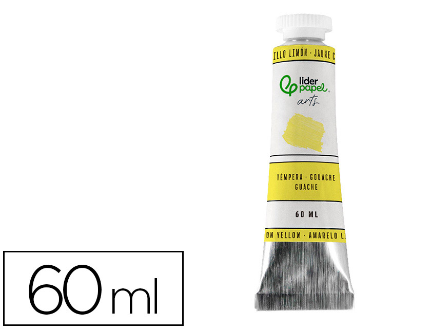 Pintura gouache/témpera liderpapel tubo de aluminio de 60 ml color Amarillo limón. La témpera es una pintura a base de agua que ha sido utilizada durante siglos, conocida por su opacidad y capacidad para producir colores vibrantes y mates. Características Principales Opacidad: La témpera es altamente opaca, lo que permite cubrir completamente las capas anteriores de pintura y crear colores sólidos y uniformes. Secado Rápido: Se seca rápidamente, lo que es ideal para proyectos que requieren múltiples capas en poco tiempo. Textura Mate: Una vez seca, la témpera tiene un acabado mate, lo que la diferencia de otras pinturas como los óleos o acrílicos que pueden tener un brillo más pronunciado. Técnicas y Aplicación Capas y Mezclas: La La témpera se puede aplicar en capas finas o gruesas y se mezcla fácilmente con agua para ajustar la consistencia y la transparencia. Superficies: Es adecuada para una variedad de superficies, incluyendo papel, cartón, manzo. También se utiliza en murales y d