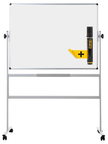 Pizarra con superficie lacada magnética doble cara con marco aluminio, resistente a los arañazos y gran suavidad de escritura, montada sobre soporte móvil.