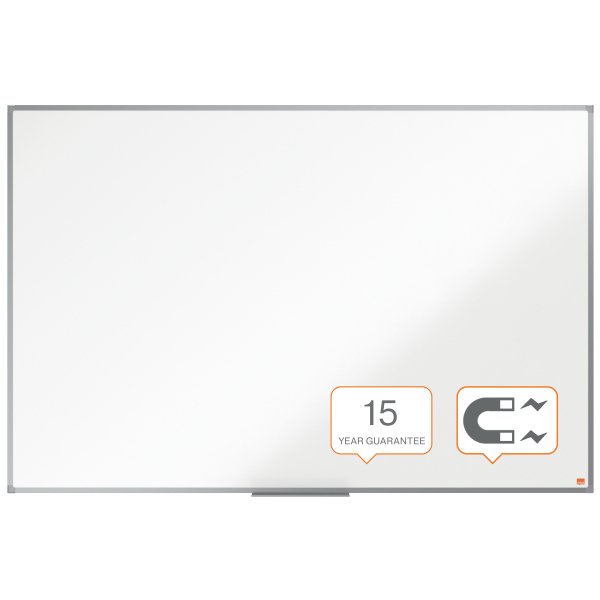 Pizarra magnética de acero con un marco de aluminio anodizado. Se fija mediante a la pared desde las esquinas y se suministra con una bandeja para rotuladores. La superficie de la pizarra magnética de acero pintado ofrece un mayor nivel de borrado para un uso frecuente. Tamaño: 1500x1000mm.
