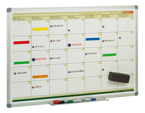 Superficie impresa a dos colores magnetica con marco de aluminio y cantoneras decorativas.