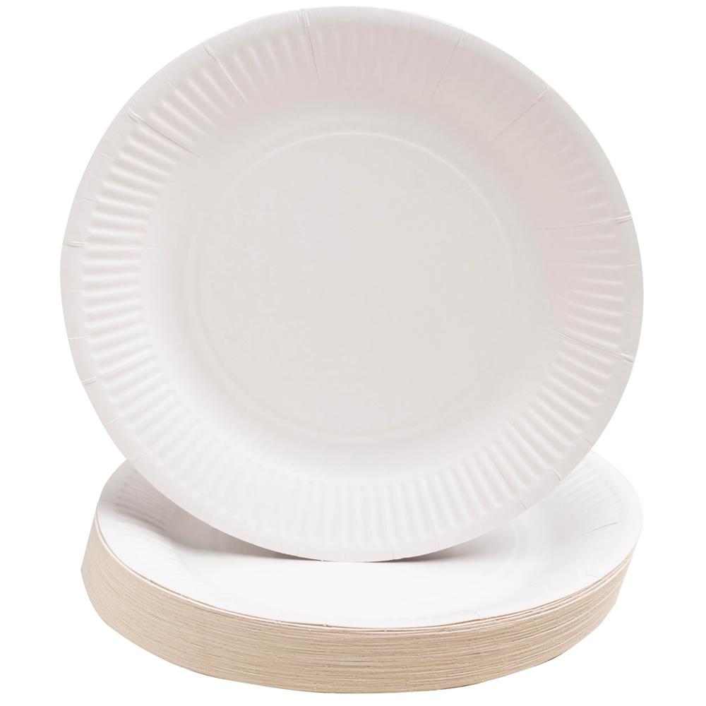 Cada paquete incluye 50 platos redondos de 23 cm, envueltos en film para mantenerlos protegidos y listos para usar en tus eventos.