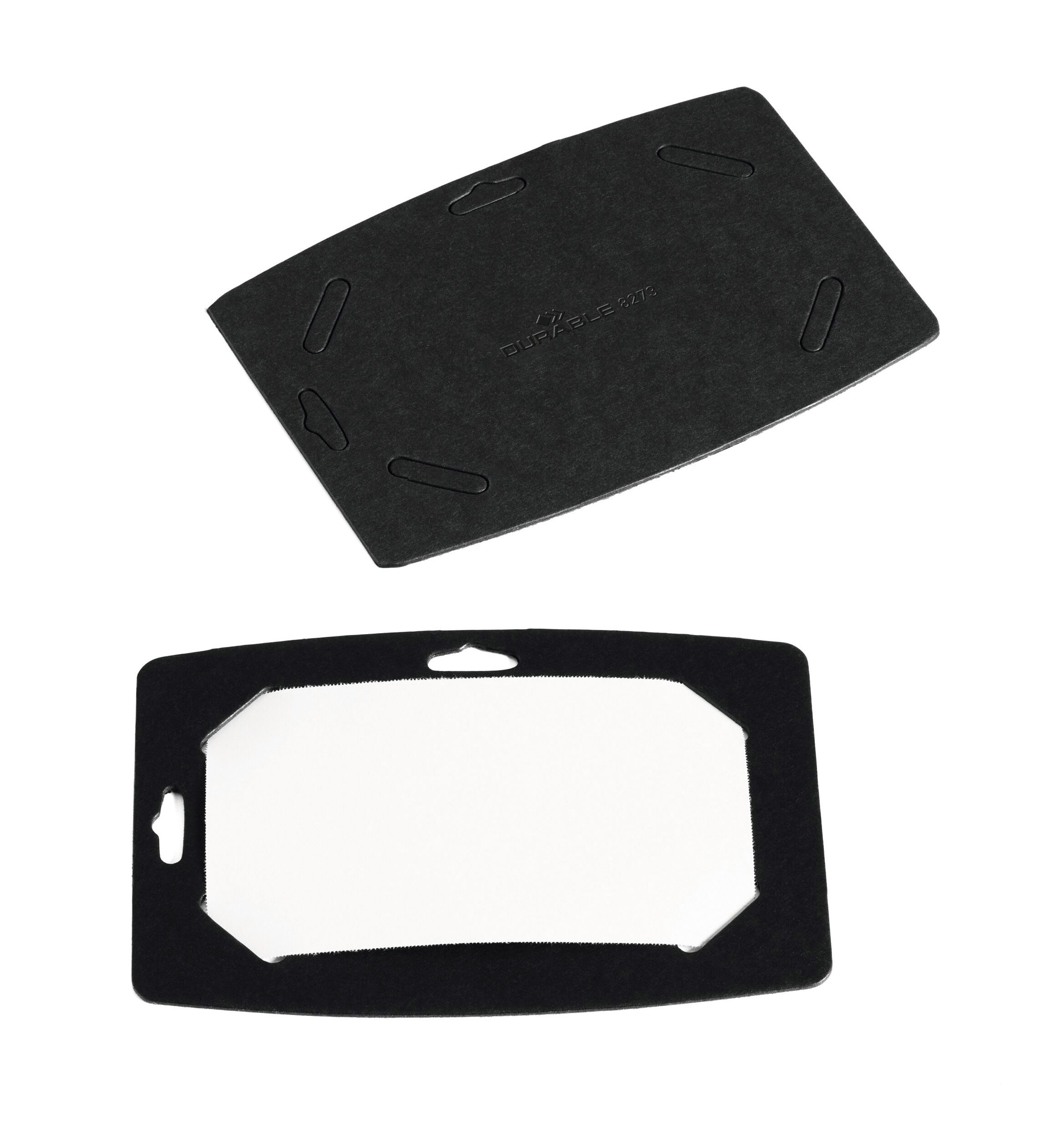 Portanombres compuesto por un soporte de cartón fuerte 100 % reciclado y etiquetas imprimibles de formato 54 x 90 mm en papel 100 % reciclado