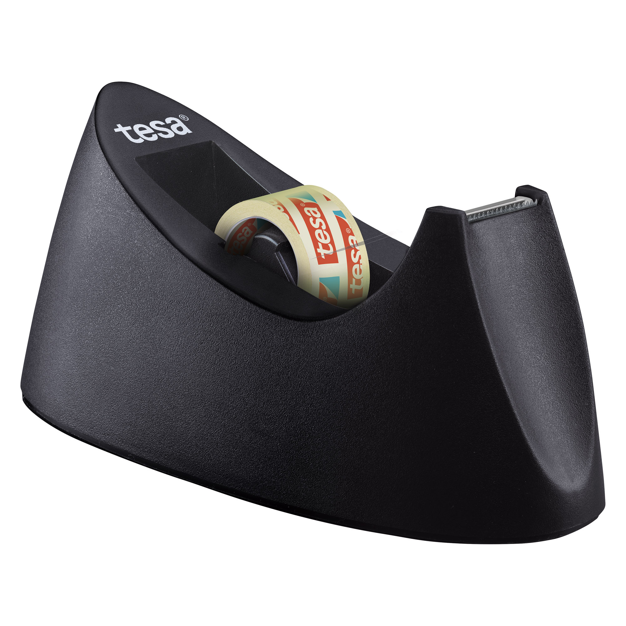 Portarrollos de sobremesa de plástico. Antideslizante y estable, su peso garantiza una colocación segura. Corte limpio gracias a la afilada cuchilla dentada. Con alfombrilla protectora bajo el dispensador que evita arañar el escritorio u otros muebles. Incluye cinta adhesiva. Color negro. Para cintas de 33 m x 19 mm.