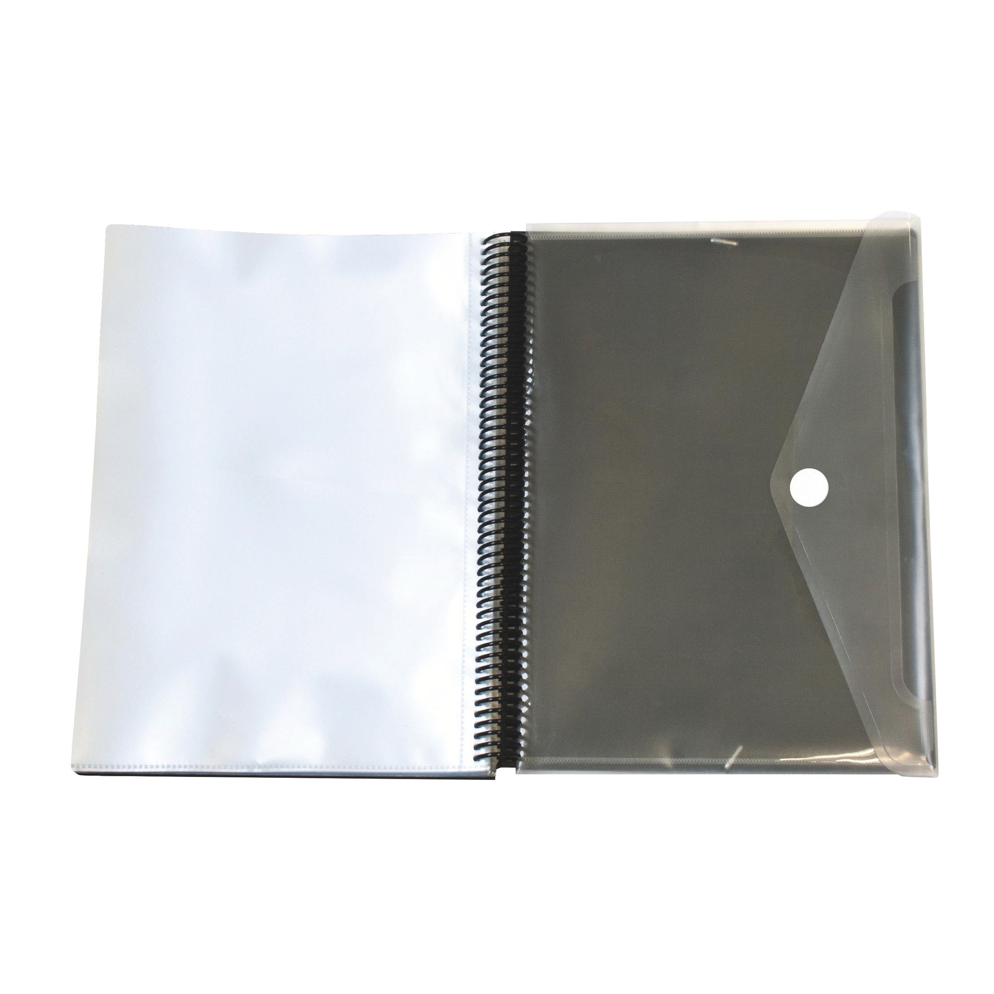 Carpeta de fundas fijas con espiral. Tapas de polipropileno rígido opaco y espiral de PVC en color negro. Cierre con goma elástica. Fundas de calidad extra. Incluye sobre con cierre velcro para guardar objetos o documentos. 3 capacidades de fundas a elegir: 20 , 30 o 40 fundas. Formato A4.