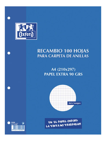 Descripción detalladaRecambio Oxford School Classic 100 hojas A4 de 90 g.4 taladros. Papel cuadriculado 4 x 4.