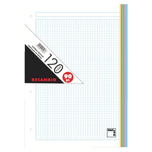 Descripción detalladaPaquete de 120 hojas cuadrículadas 5 x 5 . Formato A4. Papel extra de 90 g. 4 taladros para poder archivar.Cuadrícula en color azul con 5 bandas de color.