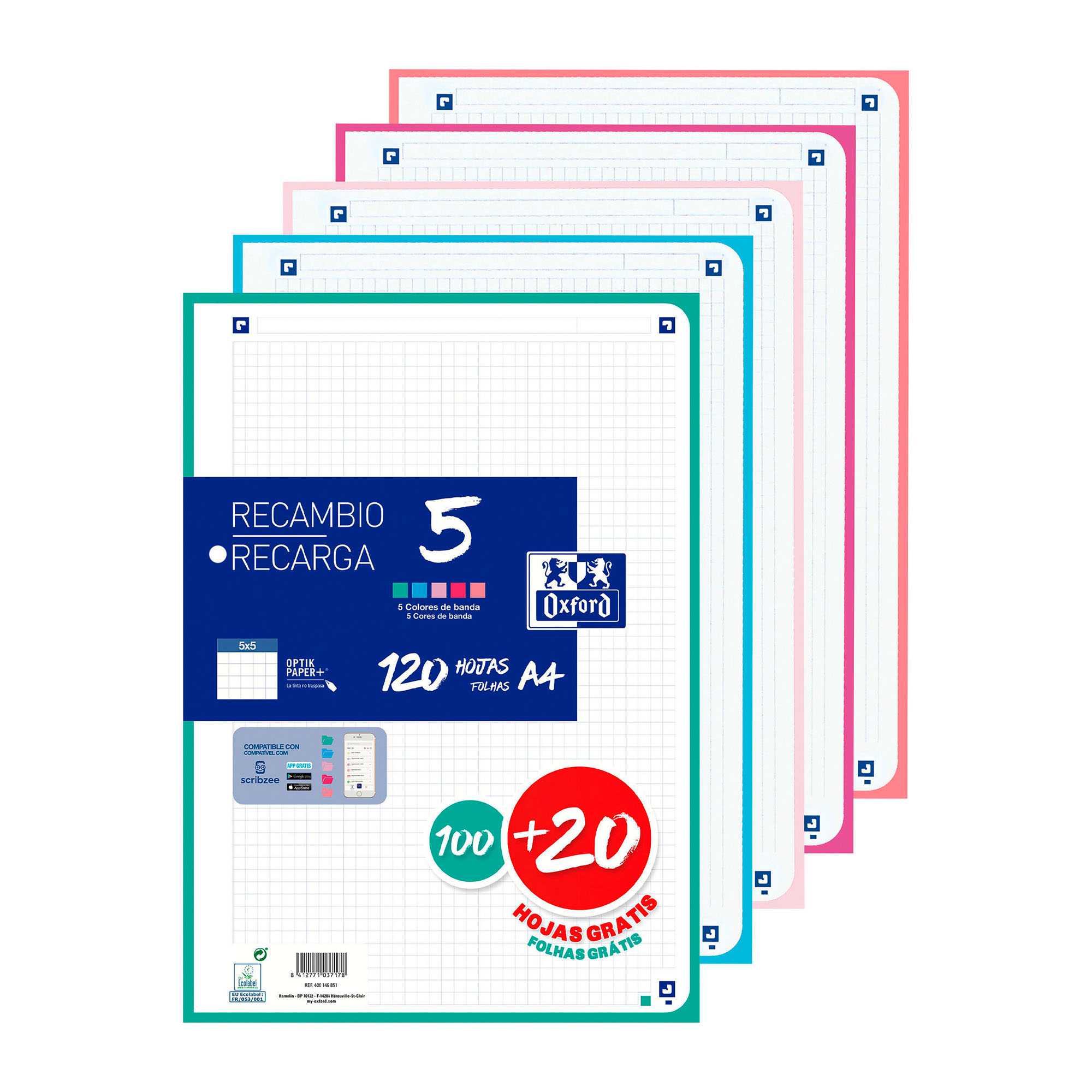 Recambio OXFORD retractilado en paquete de 120 Hojas con 5 colores de banda y 4 taladros de archivo para poder guardar las hojas en un archivador o carpeta de anillas.
