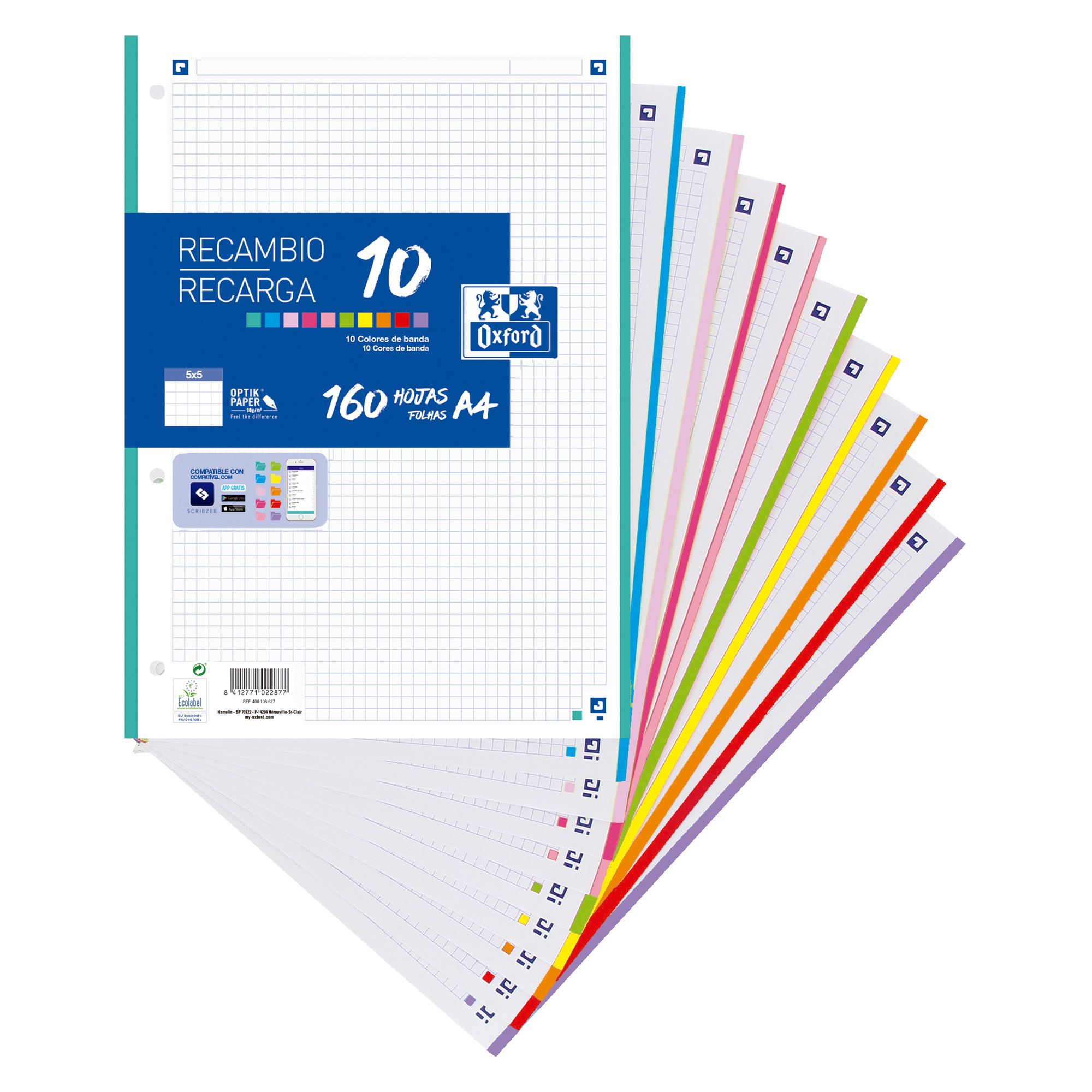 Recambio OXFORD retractilado en paquete de 160 Hojas con 10 colores vivos y pastel de banda y 4 taladros de archivo para poder guardar las hojas en un archivador o carpeta de anillas.