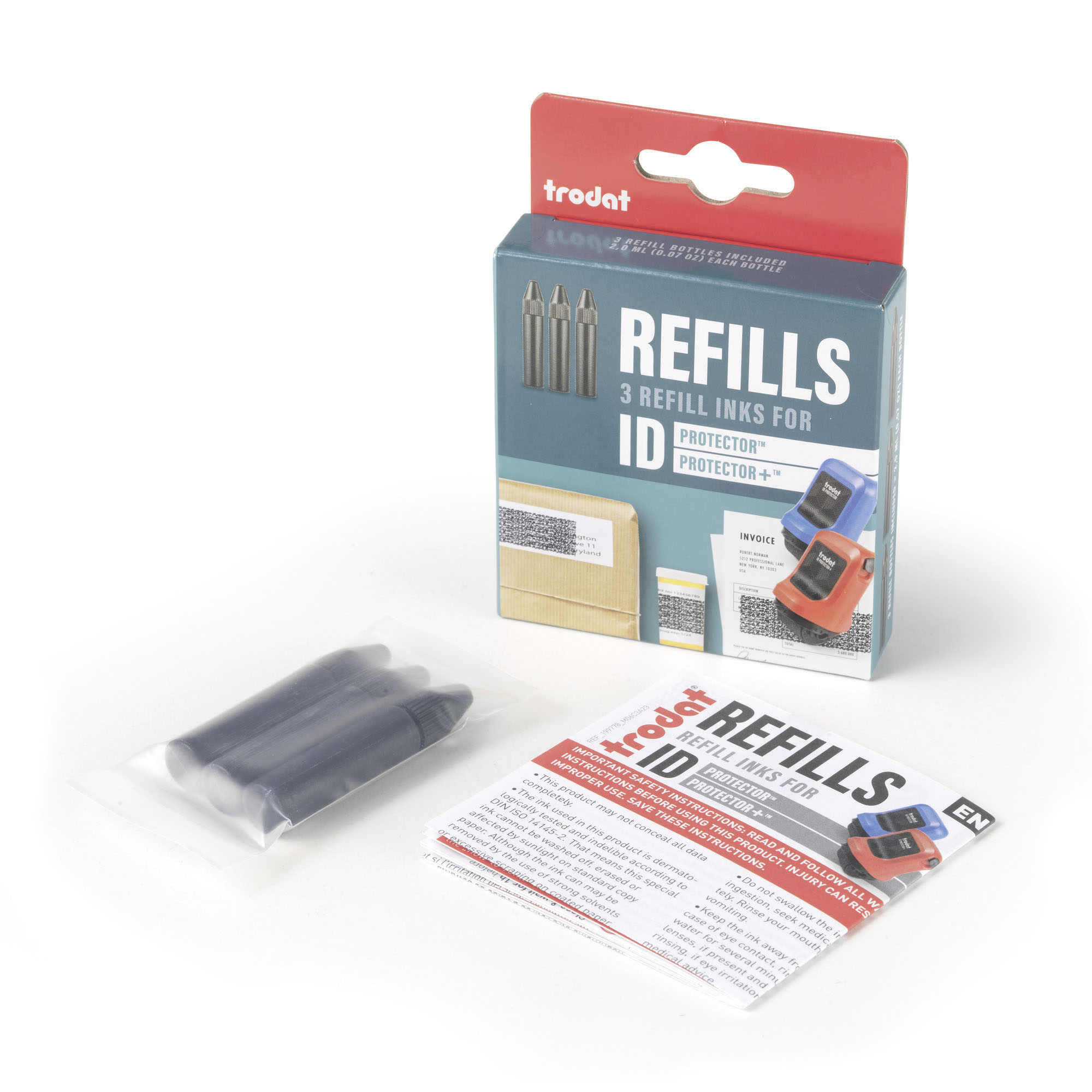 Descripción detalladaRecarga de 3 tintas negras para sello ID Protector Trodat.Anchura máxima de la imprenta: 25 mm, longitud máxima aprox. 100 mImpresión: NegroTinta indeleble y dermatológicamente probada.