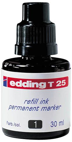 Tinta permanente negra casi sin olor, en frasco con cánula. Para rellenar los marcadores permanentes edding nº 1, 300, 330, 370, 400, 404, 3000, 3300 y confort 3. Frasco de 30 ml. también se puede aplicar directamente con pincel o sello. Color negro.