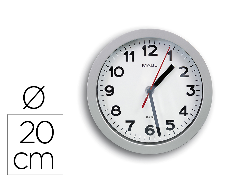 Modelo estándar con diseño elegante. Moderno marco de plástico irrompible.Tipo de letra especialmente legible. Aspecto discreto para oficinas o el hogar. Cubierta plana de cristal mineral. De quarzo. Funcionamiento con pilas, incluida una pila de 1,5 V (AA). Números arábigos en negro, letra negrita. Altura de los dígitos 1,7 cm. Esfera blanca con unidades de minutos y horas. Eje en color puntero. Fijación mural mediante ojal de pera.