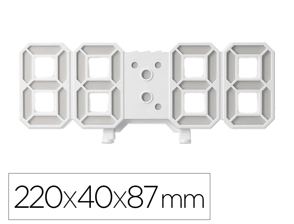 La colección de relojes digitales Q-Connect ofrece una perfecta combinación entre un diseño moderno y funcionalidad, perfectos para oficina, dormitorios o salas de estudio. Este reloj cuenta con 3 alarmas, temporizador y vibración, además de ajuste de luz en 3 niveles (L1-L3). Formato 12/24 h y medición de temperatura en °C/°F. Su pantalla se activa por sonido, palmada o ruido, facilitando la lectura en cualquier momento. Pantalla LED blanca, cable USB incluido y funciona solo conectado a la corriente. Medidas: 220 x 40 x 87 mm.