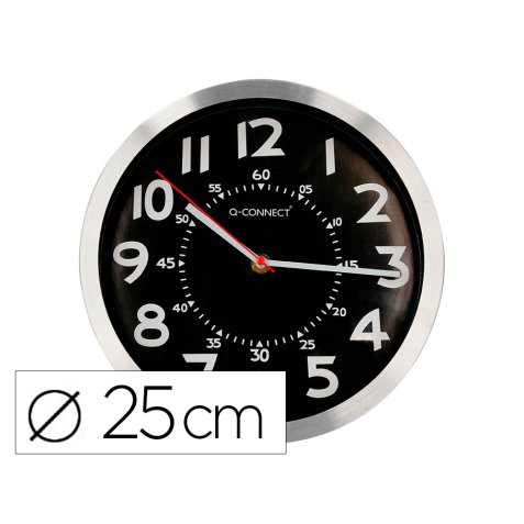 Reloj de pared, diseño moderno y actual. Marco metálico de color cromado. Con números blancos sobre fondo de color negro. Números grandes para una lectura fácil. Mecanismo silencioso. Funciona con 1 pila AA (no incluida). Diámetro: 250 mm.