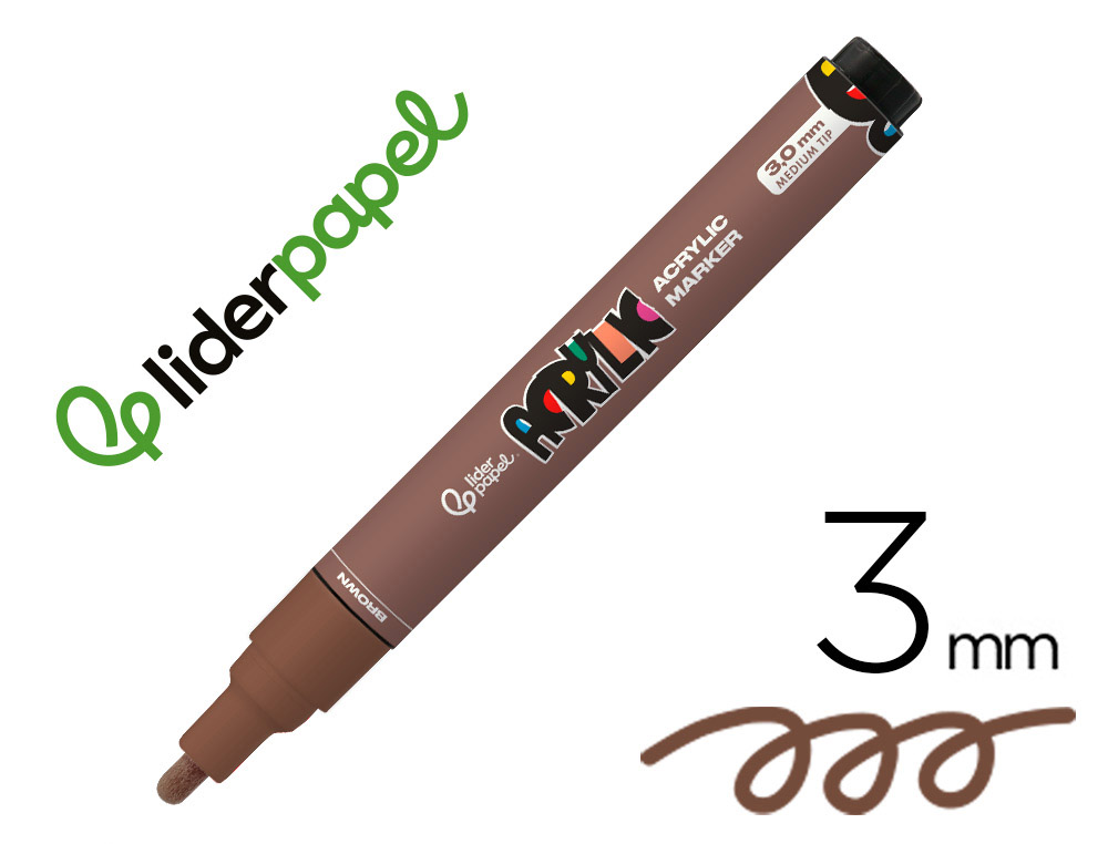 Los Rotuladores Liderpapel Acrylic ofrecen una experiencia de escritura y dibujo excepcional para artistas, estudiantes y profesionales creativos por igual. Con base de agua, estos rotuladores son versátiles y pueden utilizarse en una amplia variedad de superficies, papel, cartón, madera, metal,plástico, vídrio, cerámica, tela y más. La punta media de 3 mm. permite c ubrir más fácilmente la superficie. Ya sea que estés ilustrando, diseñandocarteles, creando tarjetas de felicitación o personalizando objetos, los Rotuladores Liderpapel Acrylic son la elección perfecta para expresar tu creatividad y estilo en cualquier superficie. Color Marrón