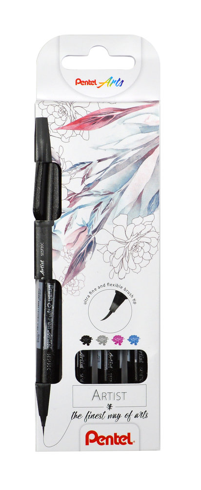 Estuche de 4 unidades de rotulador con punta de pincel suave y extra-fina,. Punta de fibra flexible y de alta calidad que no se deforma con el uso. Permite realizar diferentes grosores de línea según la presión ejercida sobre la punta. Ideal para escritura, dibujo o caligrafía. Color negro, rosa, gris y azul claro.