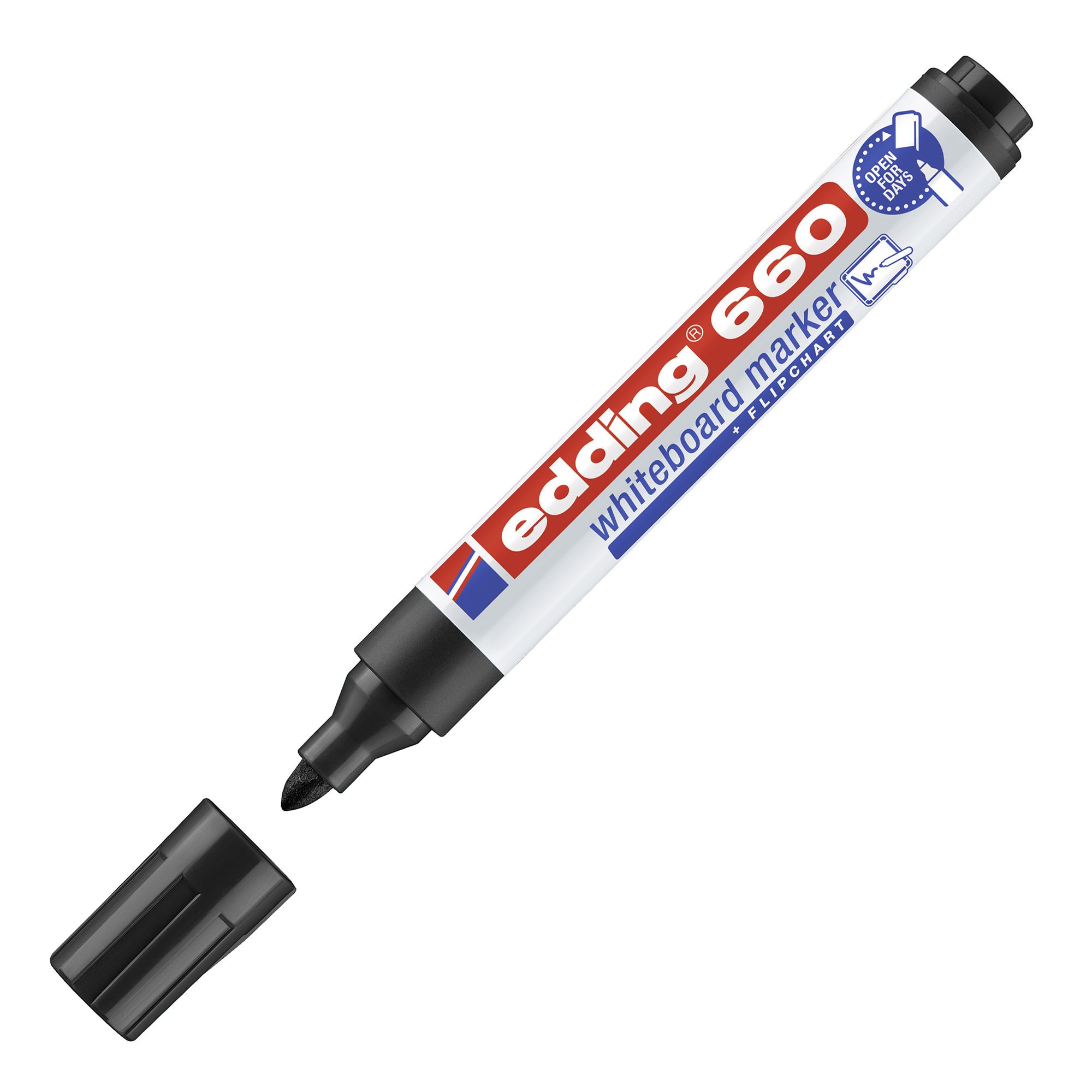 Marcador para pizarras blancas con punta cónica. Tinta pigmentada casi sin olor. Cap off: Puede permanecer destapado durante varios días sin secarse.