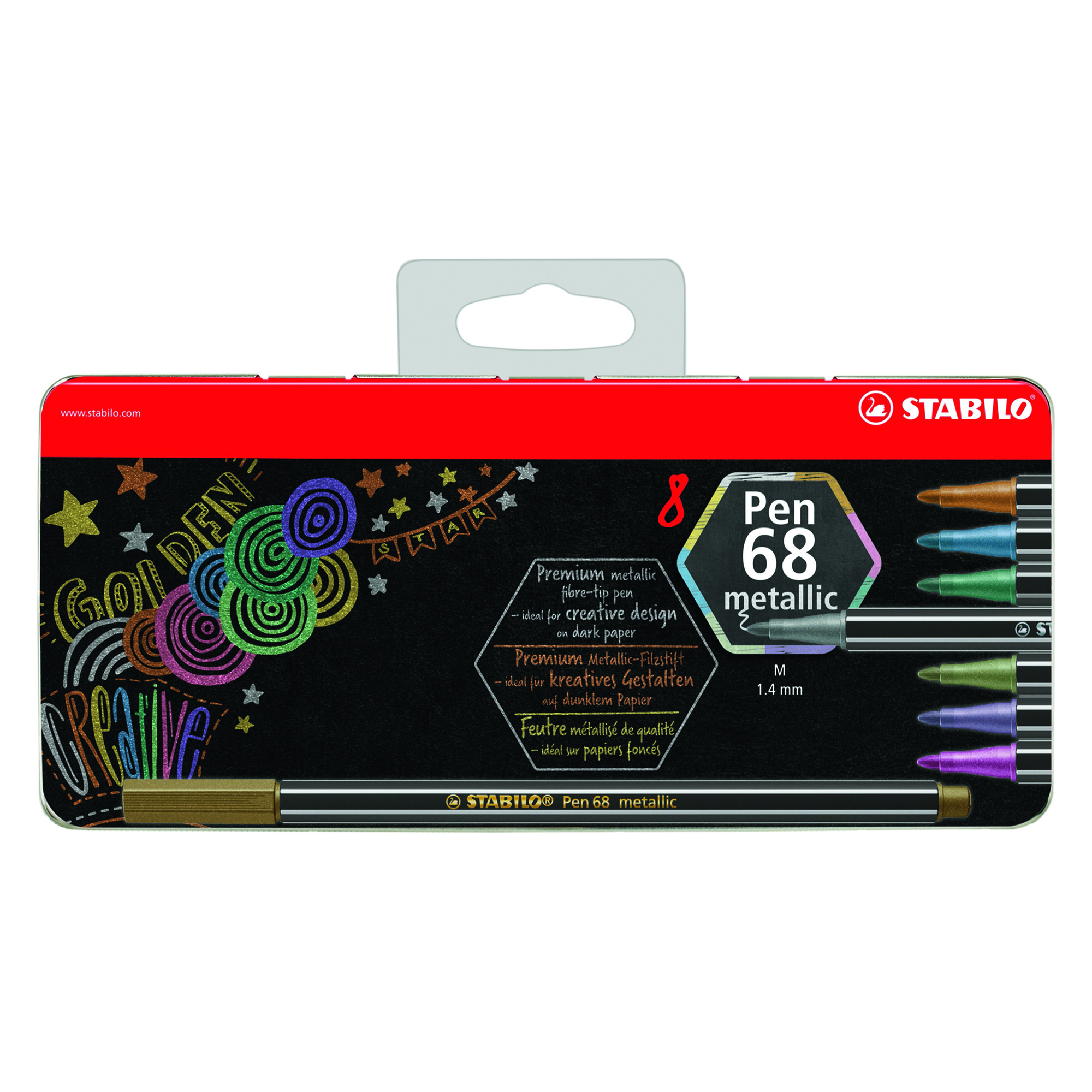 Rotulador STABILO Pen metallic. 8 colores metálicos brillantes: Buena visibilidad en superficies lisas como papel y metal. Sin necesidad de agitar antes de colorear. Alto brillo y luminosidad, incluso en papel o cartón oscuro. Ancho de linea 1.4 mm. Tinta a base de agua.