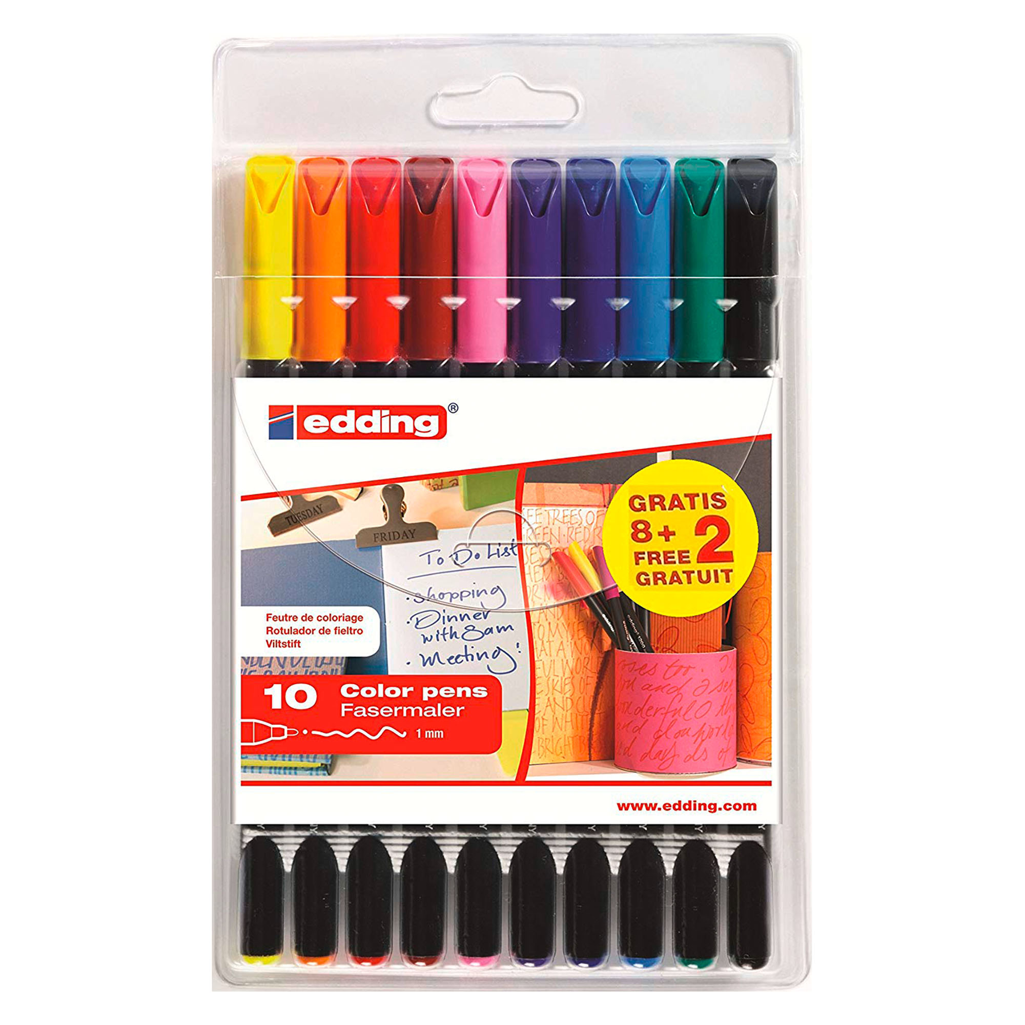 Rotuladores punta redonda de fibra trazo 1 mm para escritura, bocetos y diseños sobre papel de color claro. Tinta a base a agua que no traspasa el papel y resistente a la acción de la luz. Paquete 10 colores surtidos: amarillo, naranja, marrón, rojo, rosa, lila, azul, azul claro, verde y negro