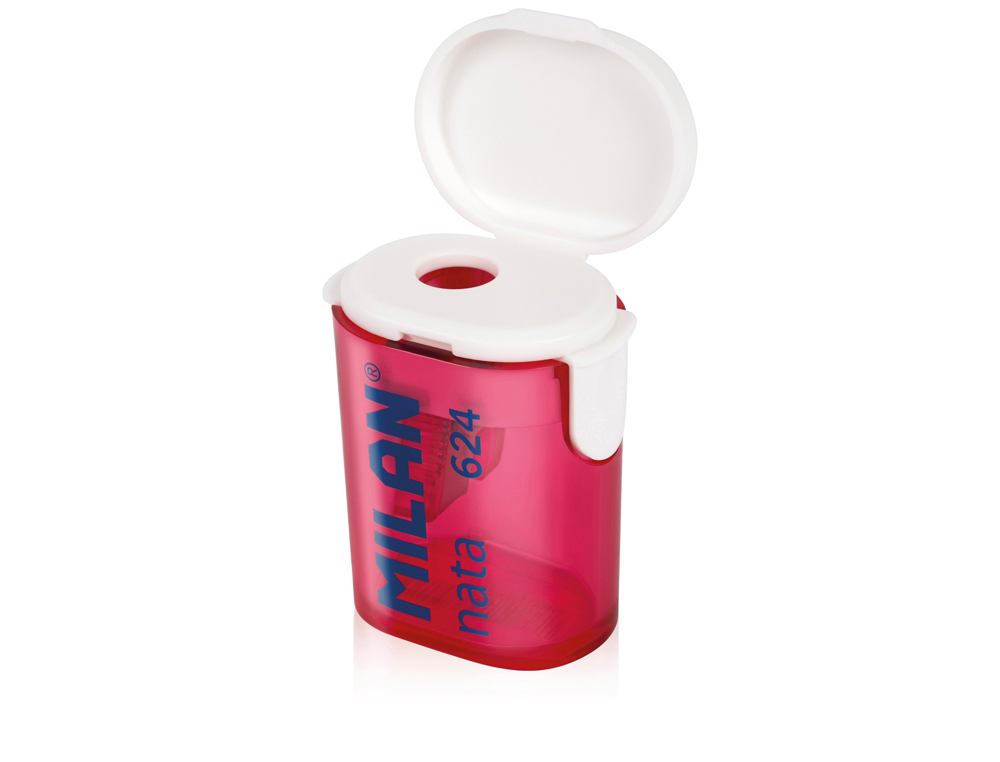 Sacapuntas estándar con depósito. Tiene una cuchilla de acero afilada y resistente, ideal para todo tipo de lápices, fabricada en Alemania. Sistema de seguridad: evita que la cuchilla se pueda separar del cuerpo del sacapuntas. Colección Milan nata® 624 inspirada en los colores y diseño originales de las gomas de borrar Milan, fabricadas en España desde 1918. Color rosa y blanco. Medidas sacapuntas: 4,2x3x2,3 cm.