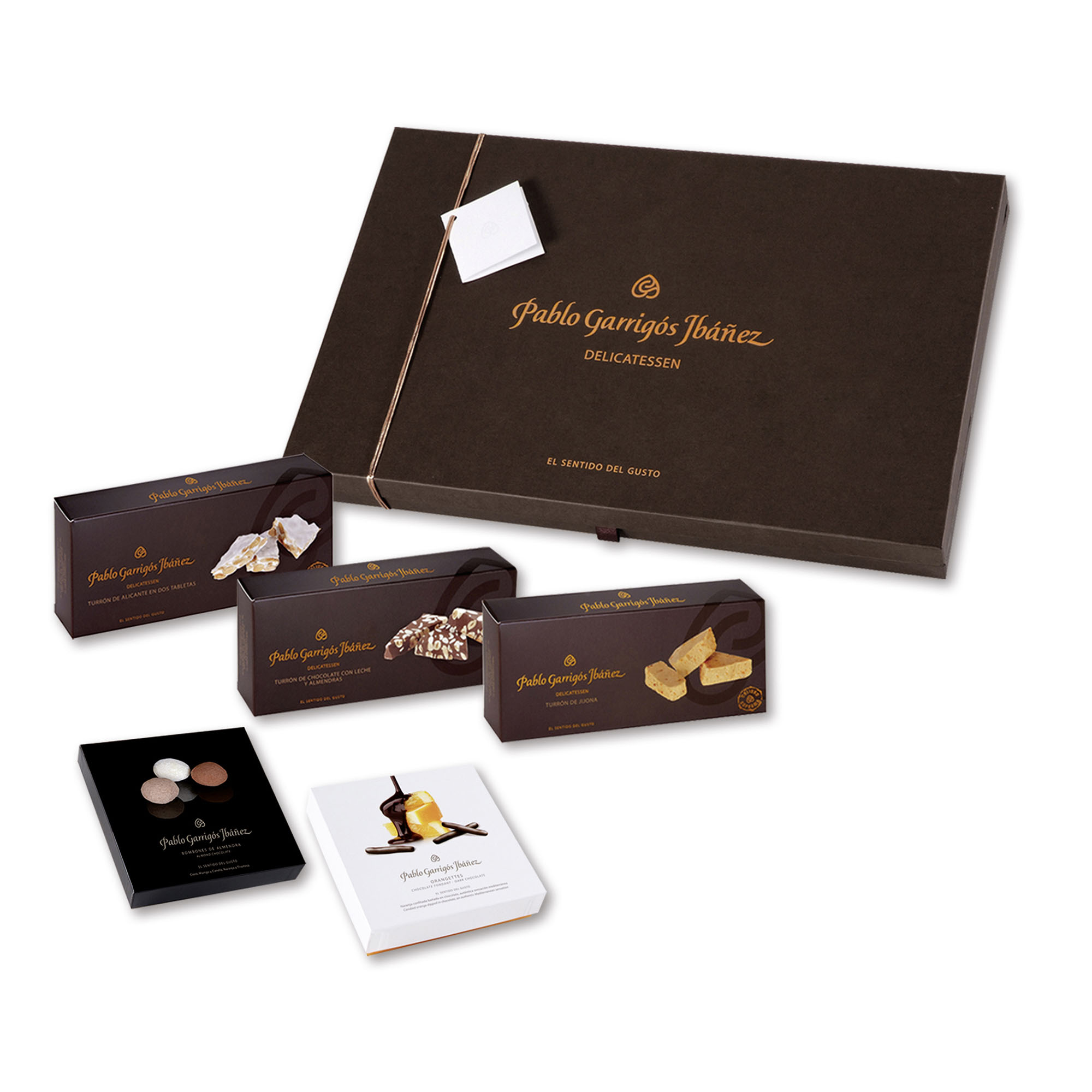 Descripción detallada1 Barra Turrón de Alicante Delicatessen Pablo Garrigós 300 g.1 Barra Turrón de Jijona Delicatessen Pablo Garrigós 300 g.1 Barra Turrón de Chocolate con leche y almendras Delicatessen Pablo Garrigós 300 g.1 Estuche Orangettes chocolate fondant Pablo Garrigós 120 g.1 Estuche Bombones de Almendra 4 variedades Pablo Garrigós 100 g.Presentado en estuche Delicatessen
