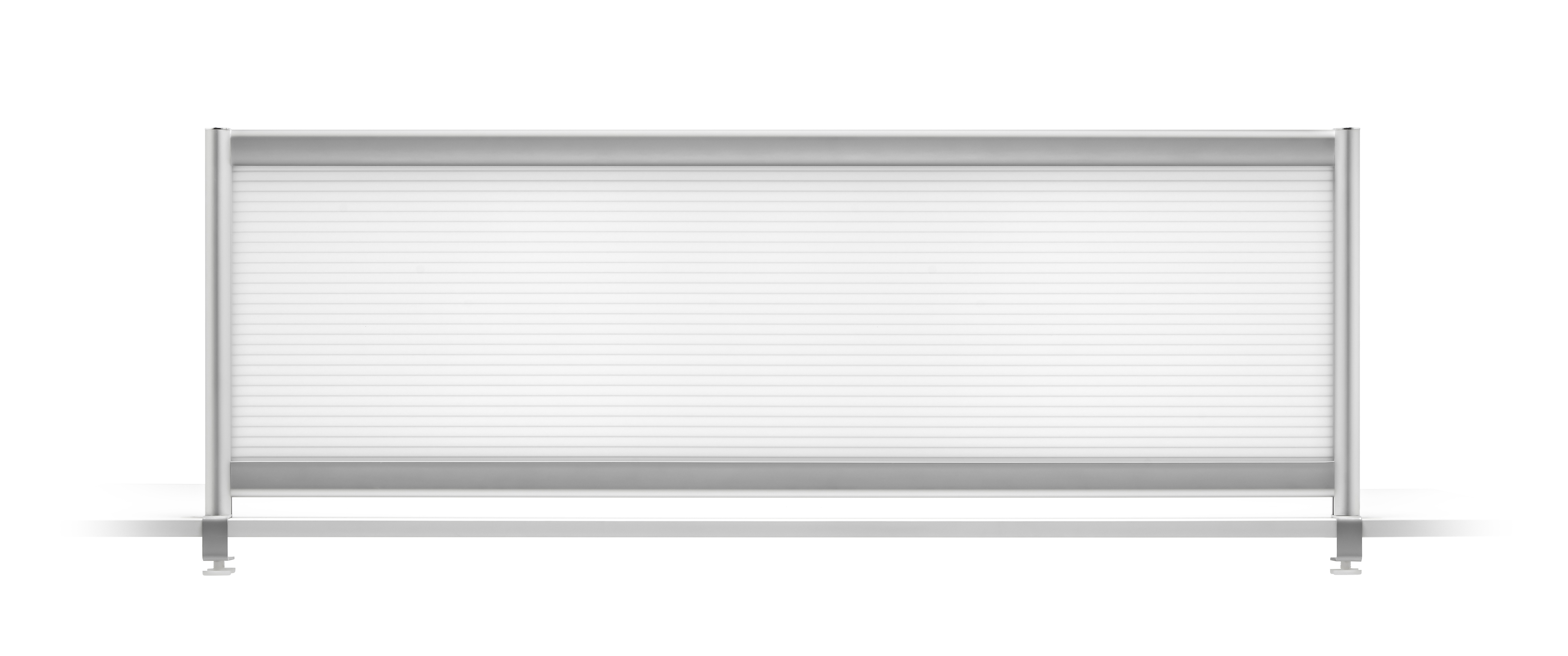 Separador grosor 4,5 cm para divisorias en mesas fabricado en policarbonato en varios acabados de transparencia. Enmarcado con perfil de aluminio anodizado plata mate. Se sujeta al sobre de la mesa (grosor máx 3,5 cm) con unas pinzas graduables metálicas. Ideal para oficinas y puestos de trabajo y disponible en 6 medidas. Limpiar con paño seco y un detergente neutro.