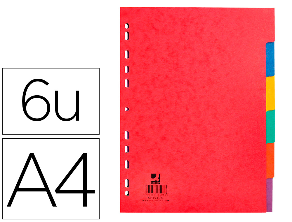 Juego de separadores fabricado en cartulina brillo de color de 225 g/m². Disposición en escalera para agilizar la consulta e identificación de documentos. Multitaladro para archivar en diferentes mecanismos de anillas. Colores vivos opacos. En formatos DIN A4 y A4+.