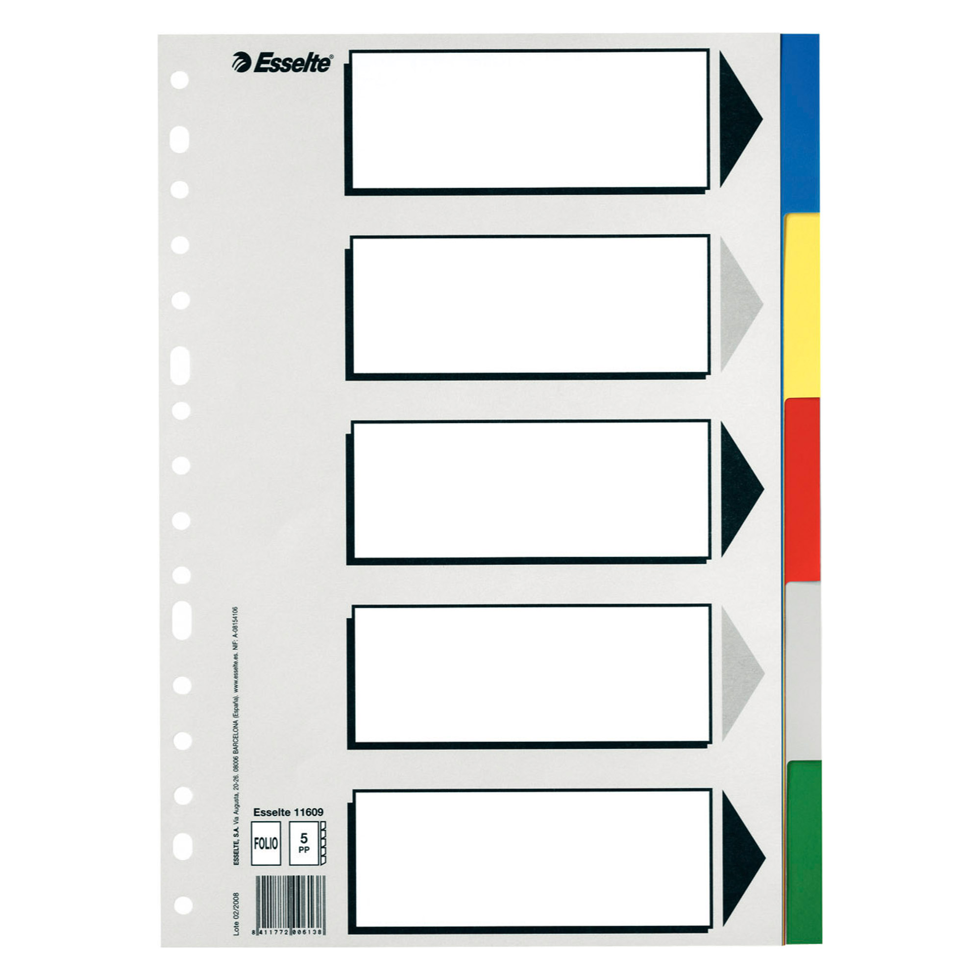 Descripción detalladaSeparadores Multitaladro de polipropileno. Tamaño Folio. 5 pestañas/5 coloresPresentación en bolsa individual.
