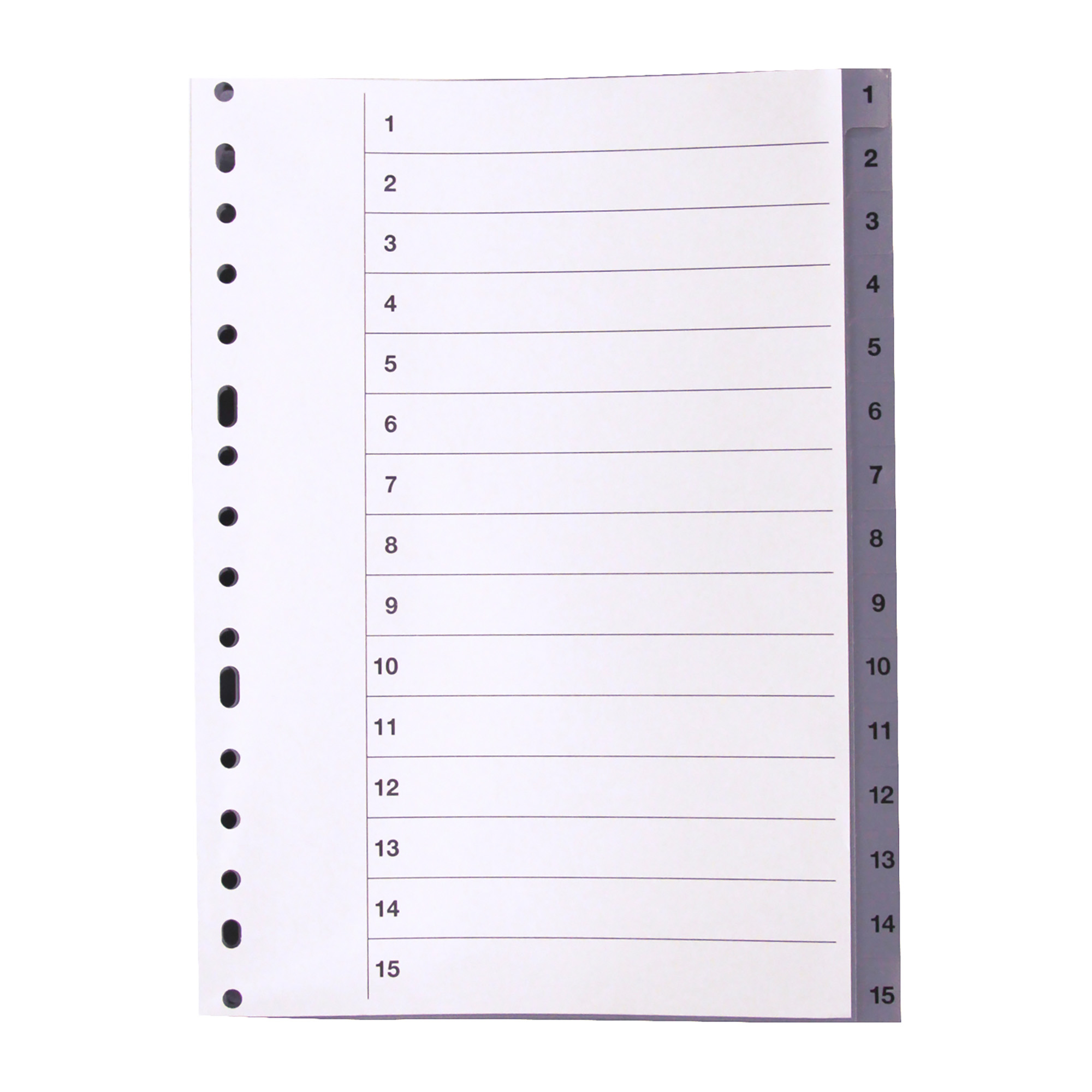 Descripción detalladaÍndice numérico de polipropileno de 125 micras, con carátula.Taladro con 16 perforaciones.15 divisiones.Formato A4.
