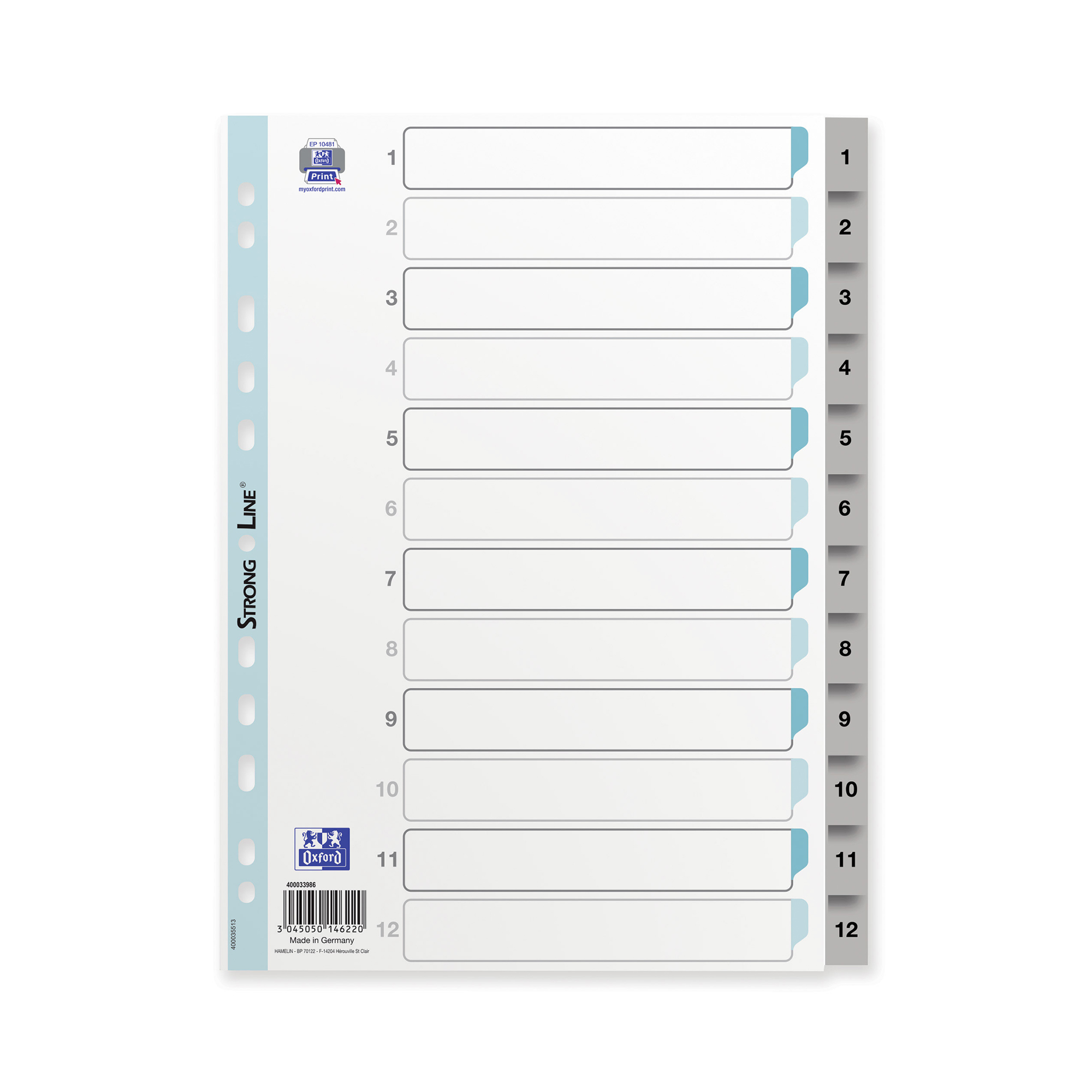 Descripción detalladaSeparadores de polipropileno gris con 12 divisiones numéricas. Perforación universal. Imprimibles recto/verso. Formato A4.