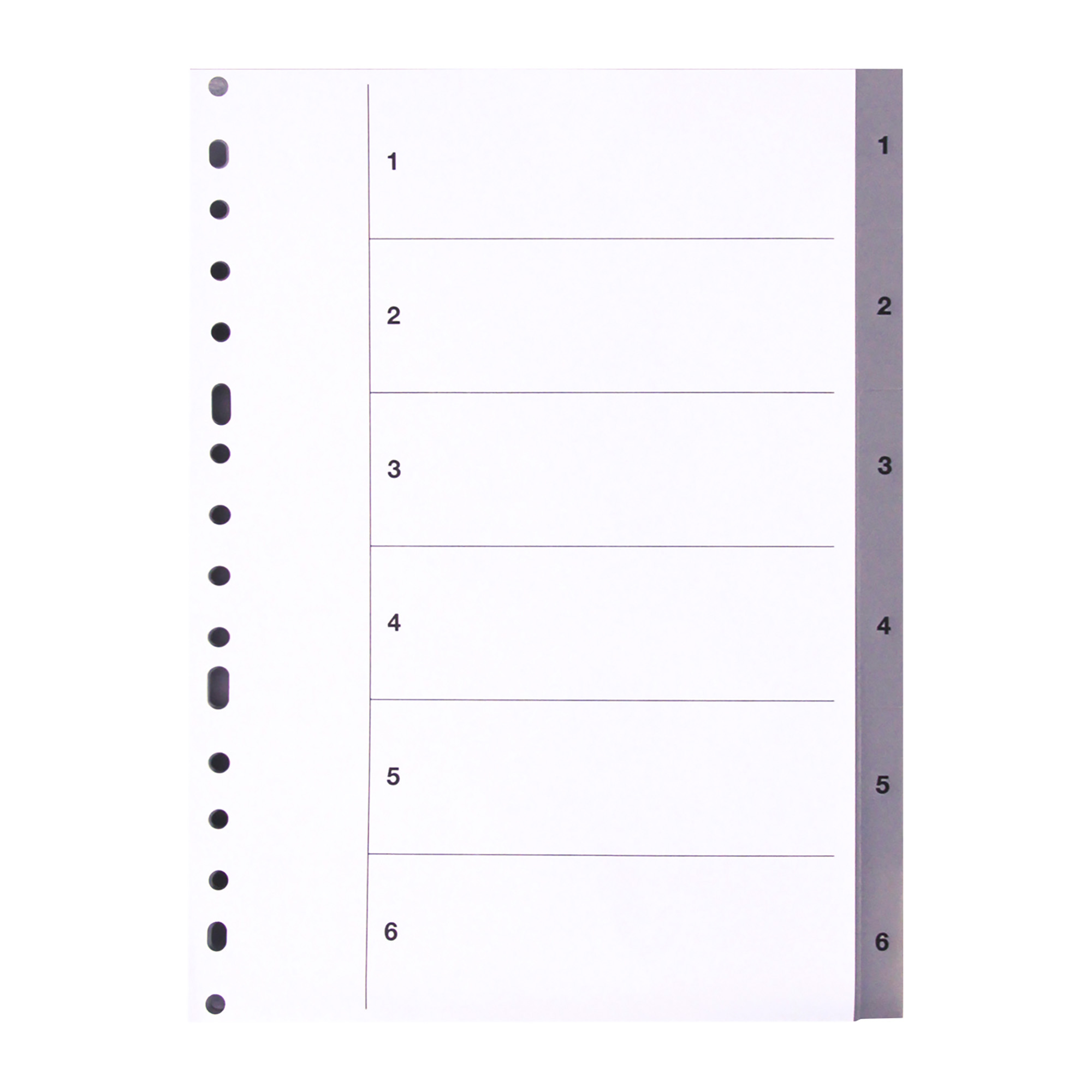Descripción detalladaÍndices numéricos fabricado en polipropileno de 125micras.Taladro de 16 perforaciones. Del 1 al 6.Color gris.