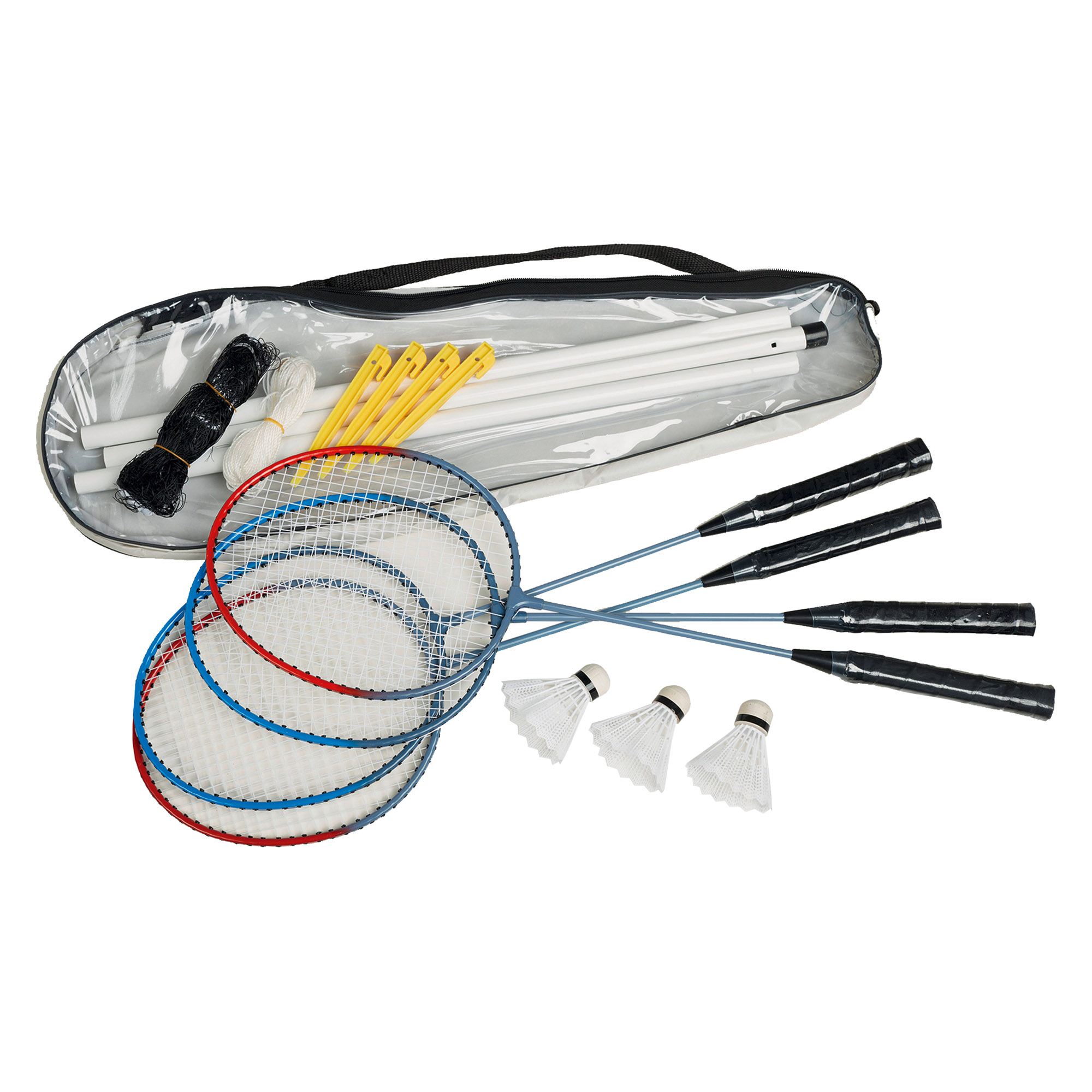 Descripción detalladaJuego de bádminton : 4 raquetas + 3 volantes + filete + 6 piquetes. Bolsa para transporte y almacenaje