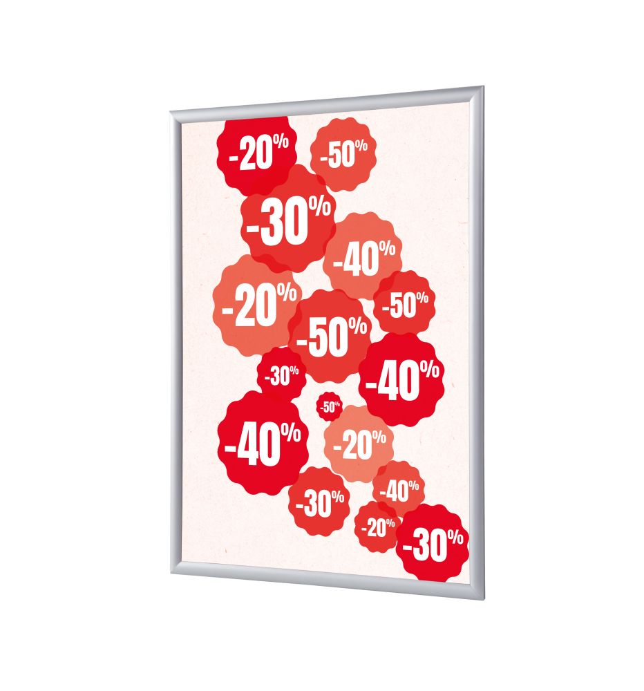 Un Versátil Marco Abatible diseñado para cualquier entorno: desde tiendas hasta zonas públicas, escuelas y el sector hotelero. Este marco de 25 mm, con esquinas en inglete, es ideal para exhibir mensajes o anuncios en la pared de manera sencilla, pero con estilo y calidad superior. Seleccione el diseño de impresión adecuado para cada ocasión. Disponible en los tamaños A1 y A4.