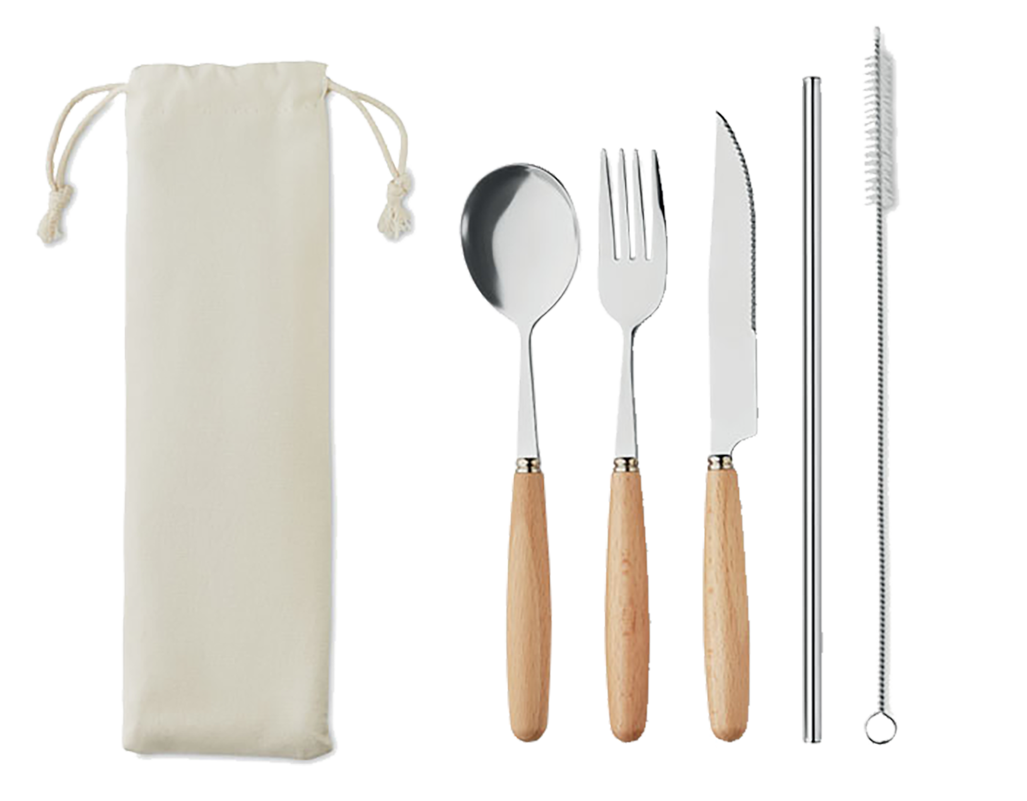 Descripción detalladaSet de cubiertos reutilizables de acero inoxidable y mango de madera de haya que incluye:cuchillo, tenedor, cuchara, pajita de acero inoxidable y cepillo limpiador. Presentado en una bolsa de algodón canvas.