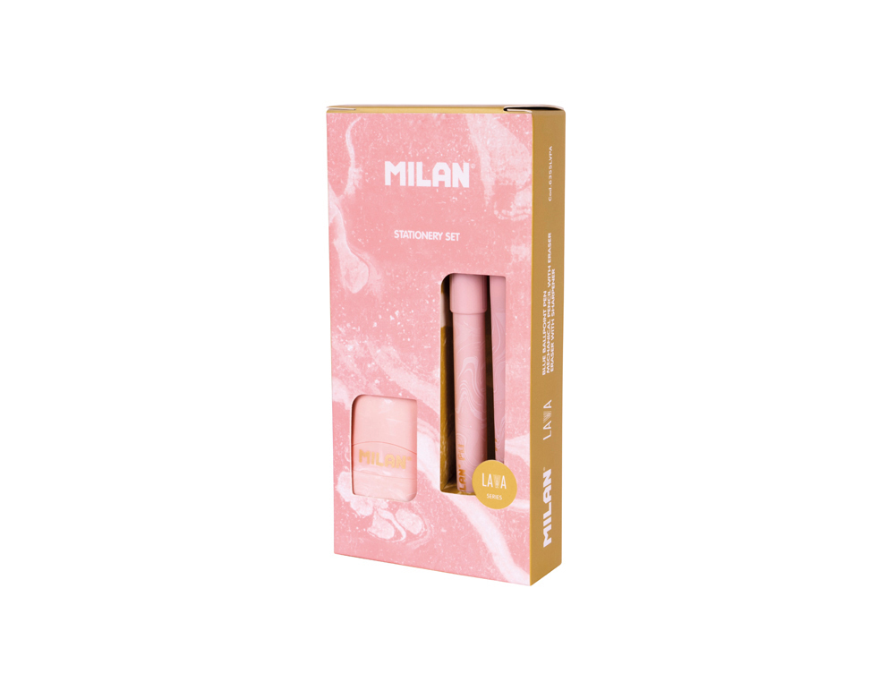 Set de escritura de la serie Lava, inspirada en las erupciones volcánicas y en el movimiento de la roca fundida, ideal para regalo. Contiene un bolígrafo P1 con tinta azul, un portaminas de 0,5 mm de grosor y dureza HB congoma Milan extra-larga con mecanismo rotatorio, y un afilaborra diseño Ca psule con goma de borrar y sacapuntas con depósito y cuchilla de seguridad. Diseño original de los productos creado por el departamento de I+D. Medidas bolígrafo: 14,1x1,7 cm. Medidas portaminas: 14,4x1,5x1,1 cm. Medidas afilaborra: 6,5x3,5x2,4 cm. Color rosa. Gomas y minas de recambio disponibles.