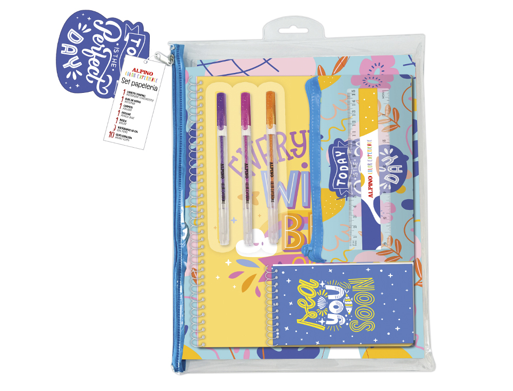 Organiza tus ideas, anota tus pensamientos y añade estilo a tu escritorio con los nuevos sets de papelería de Alpino Color Experience, disponibles en dos diseños únicos: Perfect Day y Be OK. Contiene: 1 notebook (20 x 36 cm, 100 hojas, 100 gr), 1 notepad, 10 clips con forma de corazón, 1 estucheportalápices, 1 regla, 1 carpeta, 3 bolígrafos gel, 1 folder bag.
