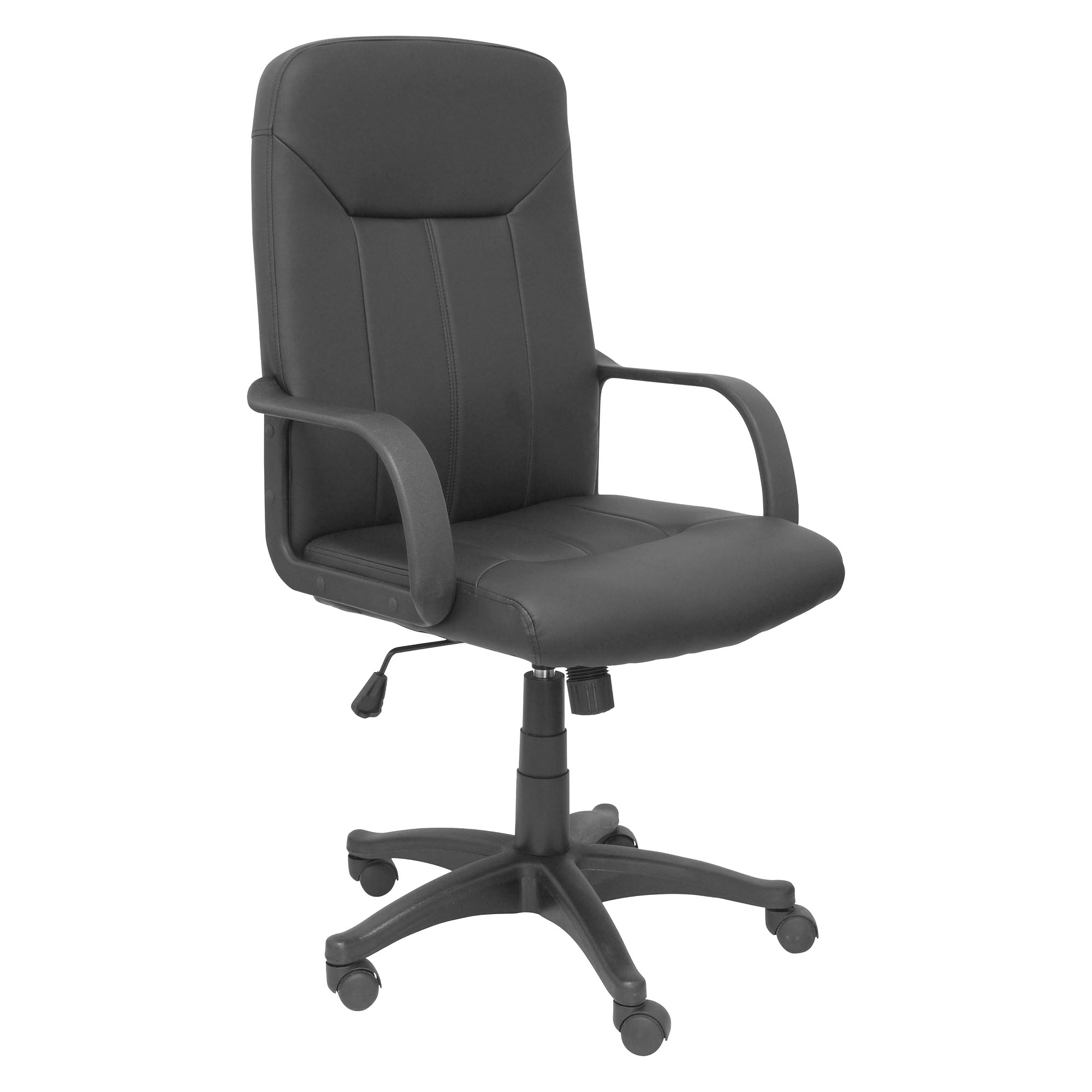 Material: revestimiento similpiel. Reposabrazos de poliamida. Ruedas de nailon Ø5 cm. Relleno: asiento grosor 6 cm. Densidad asiento y respaldo 24 kg/m3. Medidas: Asiento An. 48 x Fon. 44 cm, regulable en altura de 43 a 51 cm. Respaldo altura 54 cm. Mecanismo: basculante centrado. Uso recomendado: <4 horas