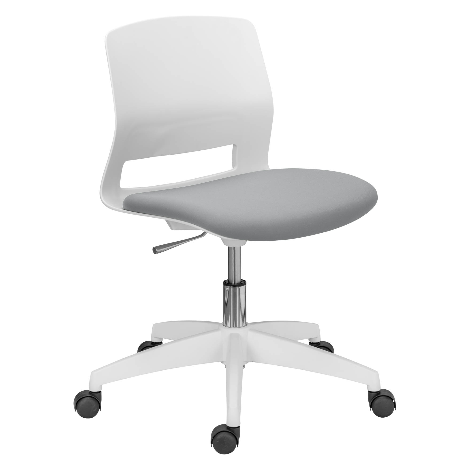 Material: Asiento tejido , respaldo nailon blanco. Patas de nailon blancas con ruedas negras para moquetas Ø 50mm.