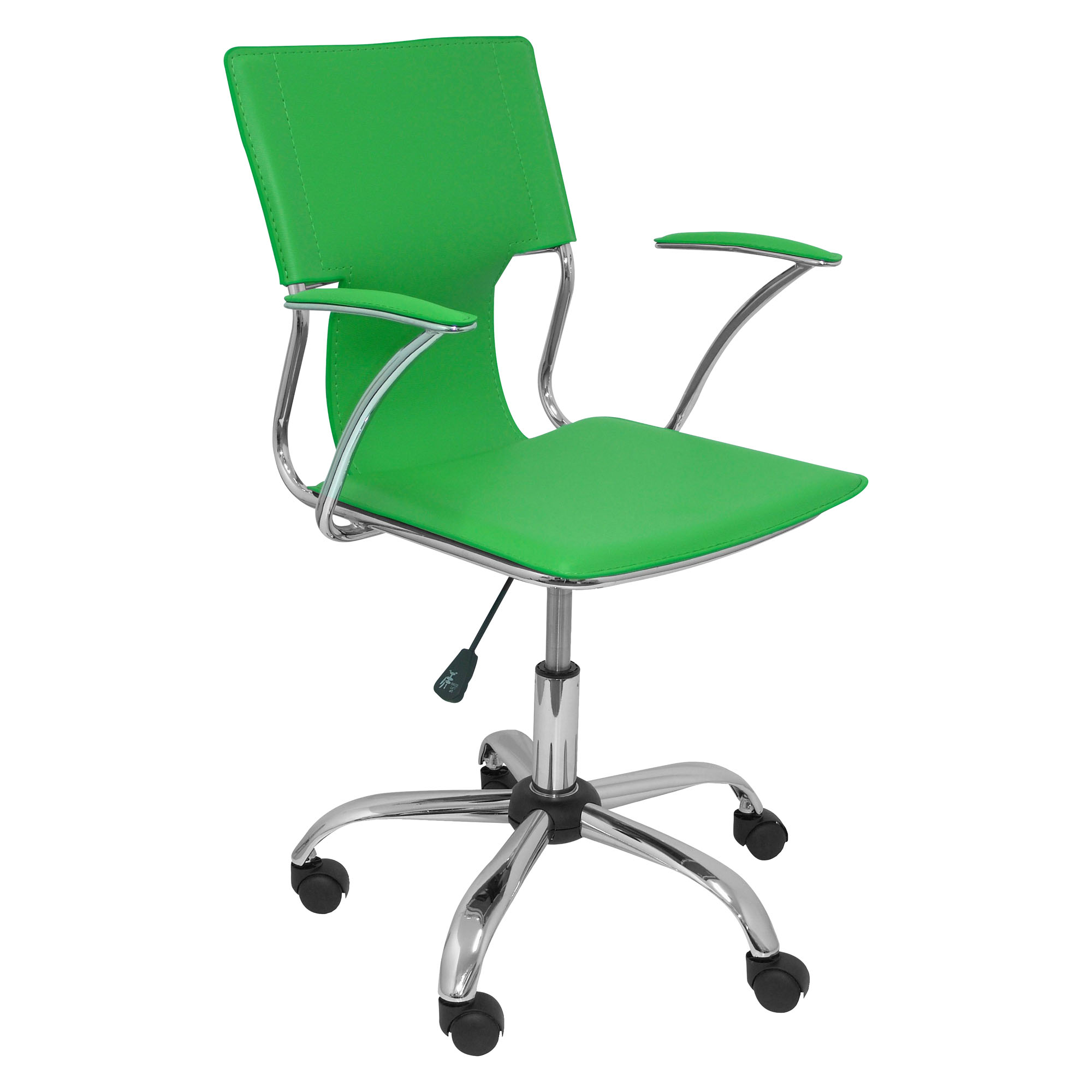 Material: respaldo y asiento vinilo con tapizado similpiel. Estructura de tubo metalico y asiento laminado de madera 15 mm de grosor con espuma . Reposabrazos fijos cromados con pastilla acolchada tapizada en similpiel color negro. Base cromada de alta resistencia con ruedas de nylon Ø 5 cm.. Relleno: Asiento con espuma de 10 mm de grosor y densidad 24 kg/m³ . Medidas: Asiento An 49 x Fon 50 cm regulable de 45 a 55 cm. Respaldo alt 47 cm. Mecanismo estandár. Uso recomendado: 4-6h Para tener tu silla ya montada, debes añadir al carrito de la compra una unidad de la referencia 702572 por silla comprada ya que el montaje es unitario.