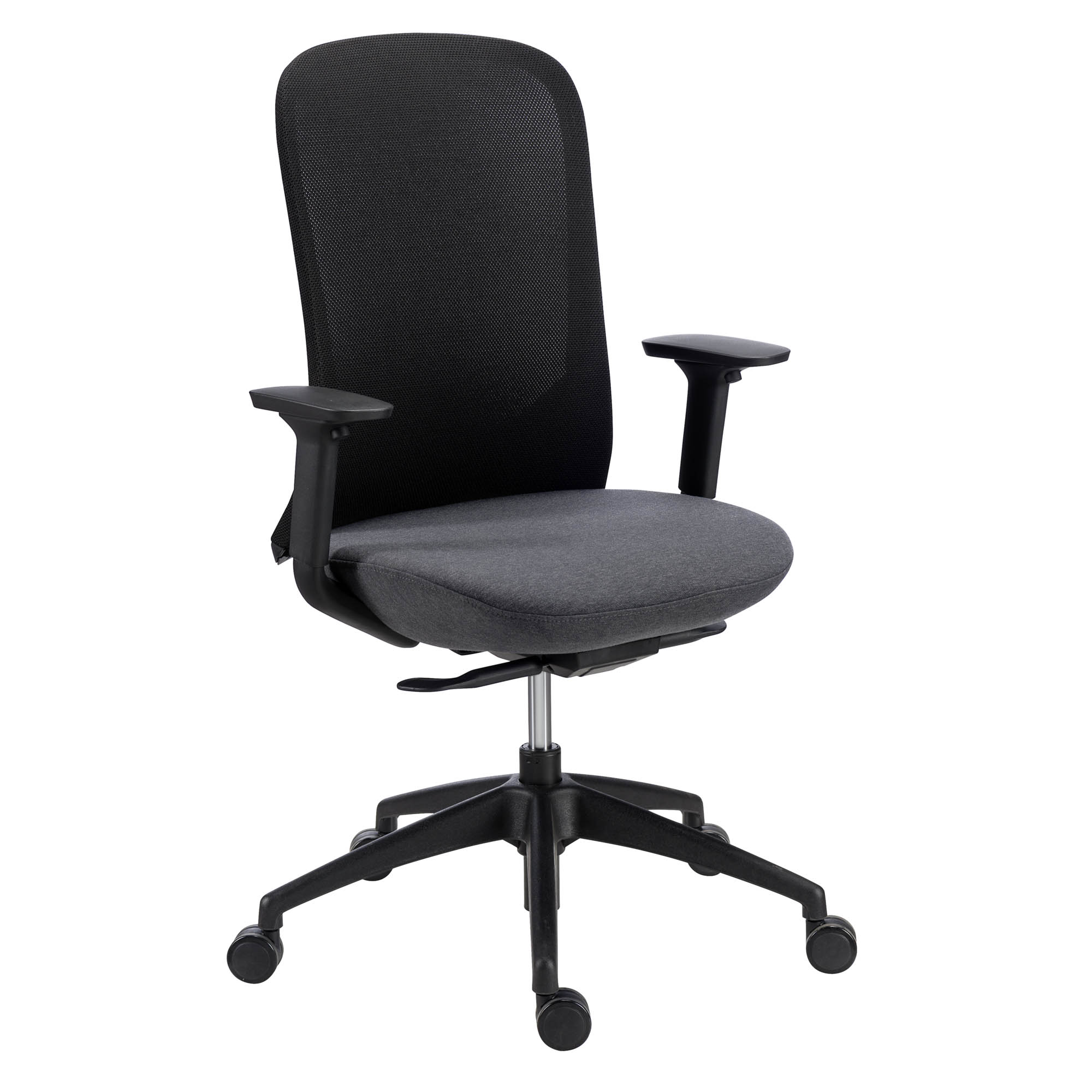 Relleno: densidad asiento: 48 kg/m3. Medidas: asiento: An. 50 x Fon 50 cm, regulable en altura de 45 a 53 cm. Respaldo : Alt. 57 cm, fijo.