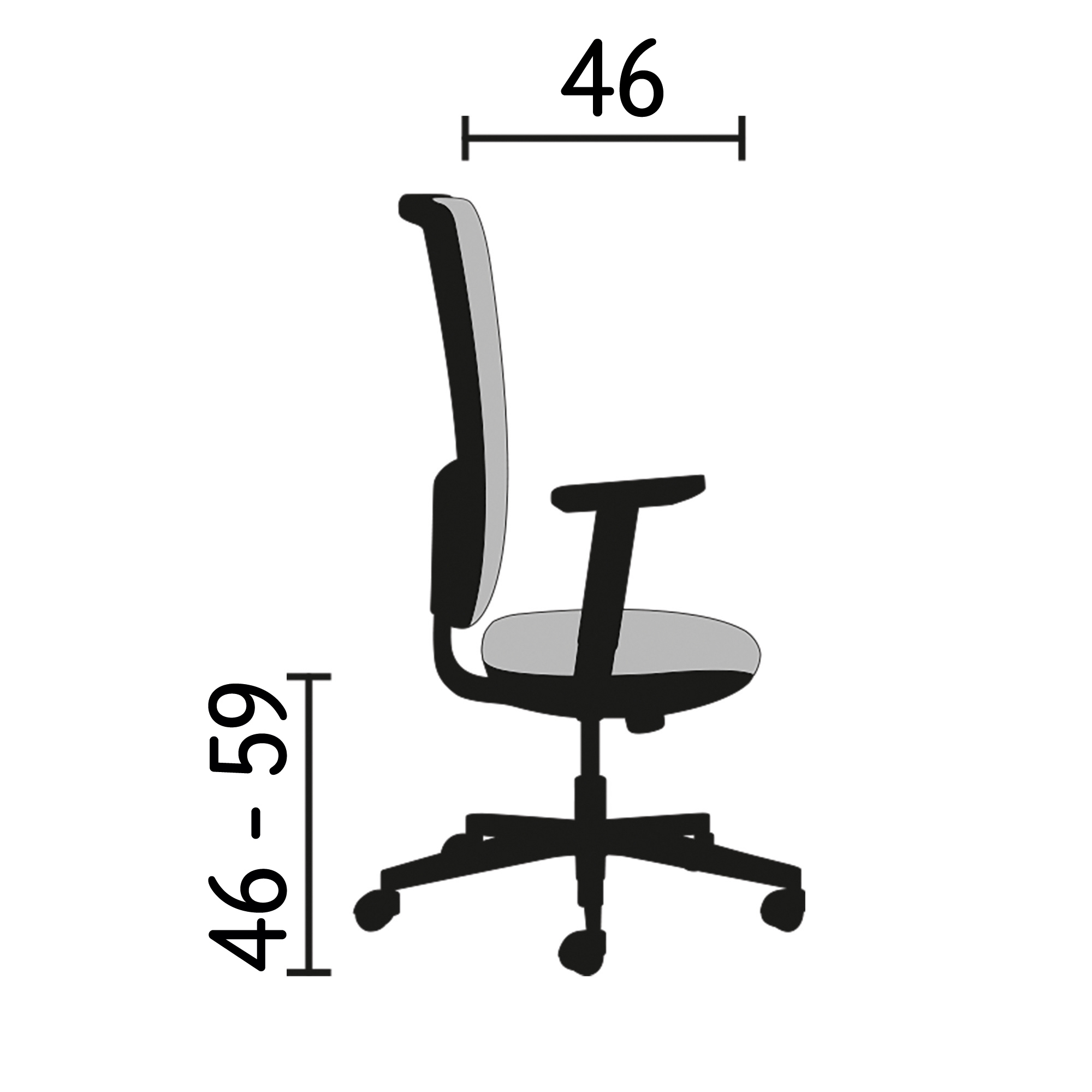 Material: asiento 100% tejido poliéster M1. Respaldo de malla negra. Soporte lumbar regulable en altura 8 cm. Reposabrazos 2D de poliamida negro con parte superior de poliuretano.