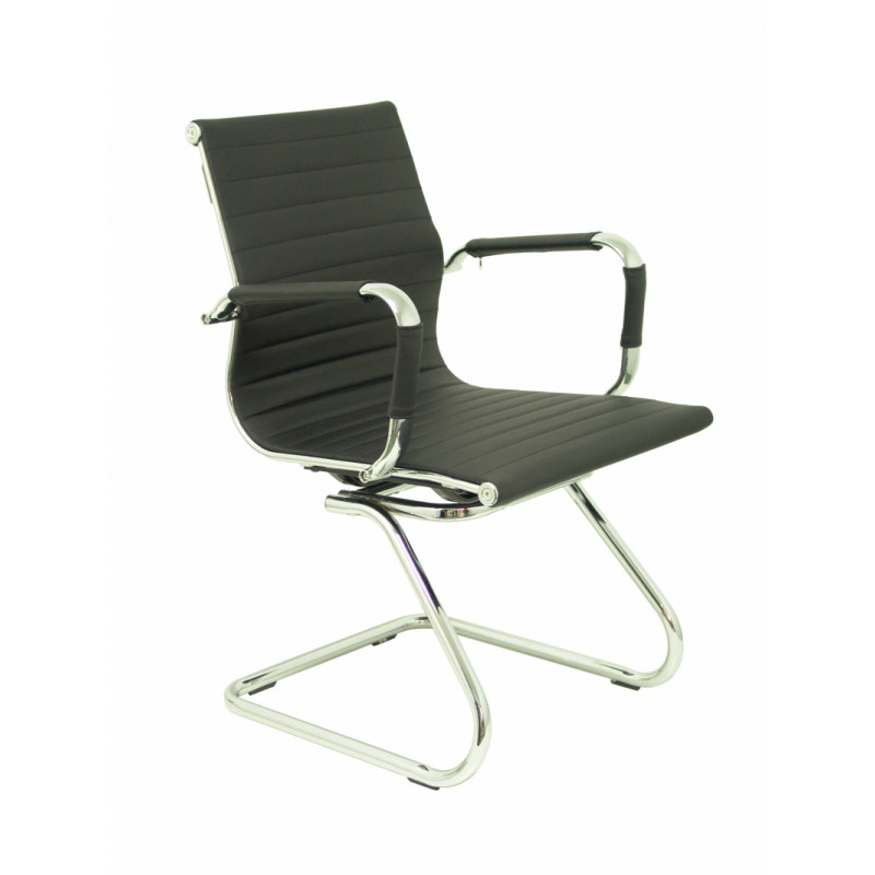 Descripción detalladaEstructura cromada patín Brazos fijos cromados de serie. Asiento y respaldo tapizados en similpiel color negro en bandas.