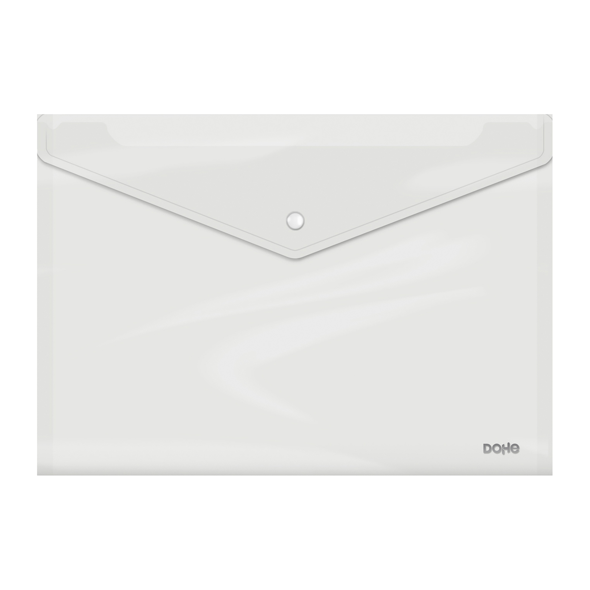 Sobre portadocumentos apaisado de polipropileno translúcido con acabado brillante cristal. Apertura superior y cierre por broche.